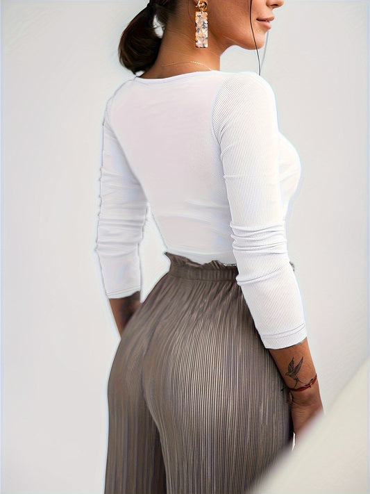 Solid Drawstring Ruched Crop T-shirt, Versatile Long Sleeve V-neck Top, Women's Clothing