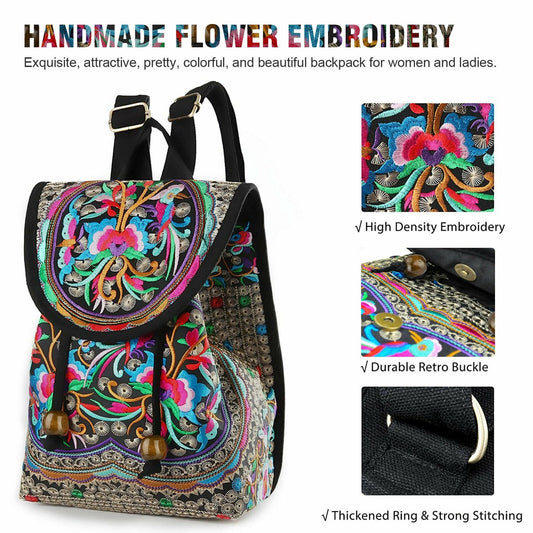 GUDAOBELL Women's Vintage Floral Embroidered Backpack - Pink Geometric Pattern Travel Bag with Tablet Compartment, Adjustable Shoulder Straps & Drawstring Closure for, Work, Daily Use