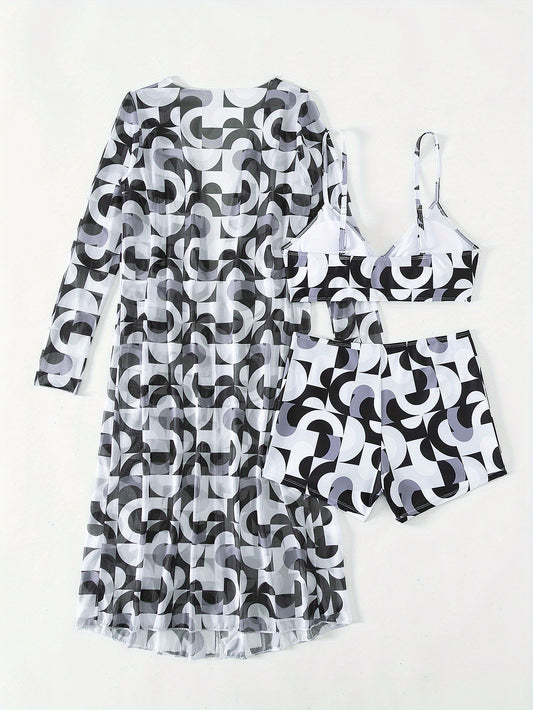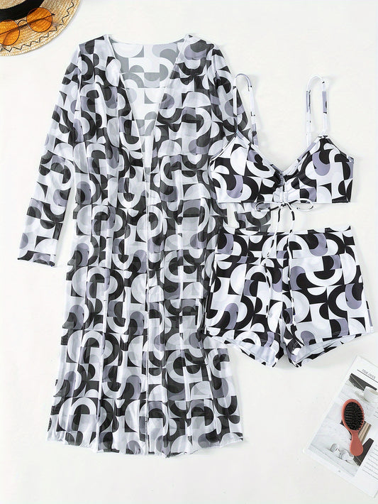 3-piece Geometrical Print Drawstring Bikini Sets, Boxer Short High Rise Bathing Suit, With Long Sleeve Sheer Cover Up Kimono Shirt, Women's Denim & Clothing