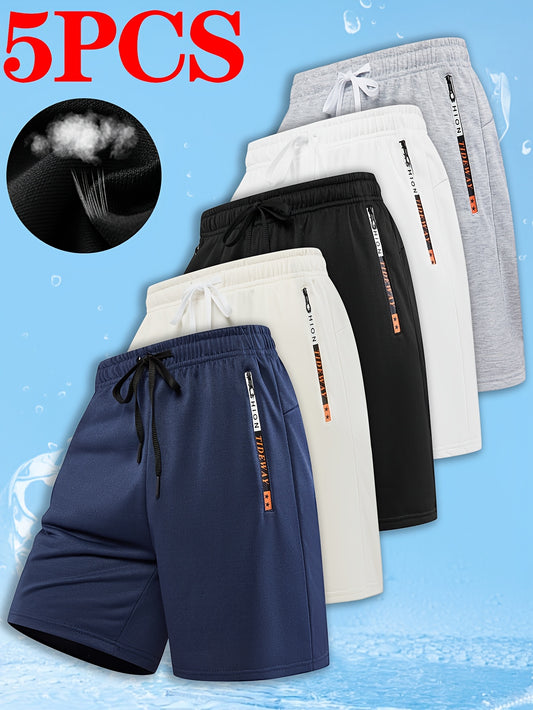 Set of 5 Mixed Color Breathable Shorts for Men, Classic Fit Knitted Shorts with Zipper Pockets, Stylish Drawstring Shorts for Summer, Available in Multiple Colors Suitable for Running, Fitness, And Training, Elastic Waist Sum
