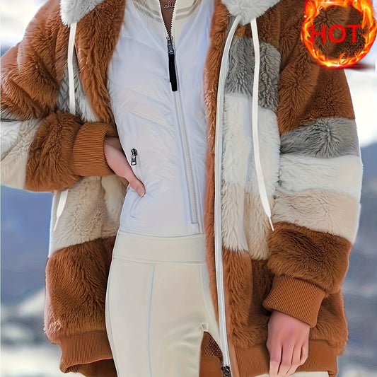 Women's Plush Faux Fur Hooded Jacket - Loose Fit Color Block Coat with Blue/Beige/White/Black Design, Long Sleeve Winter Warmth, Machine Washable for Casual & Formal Outfits, Ladies Winter Coats, Autumn Layering Piece, Formal