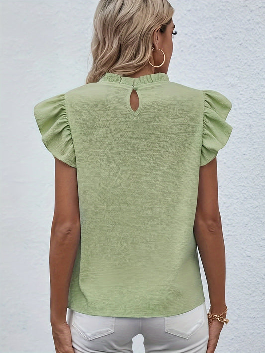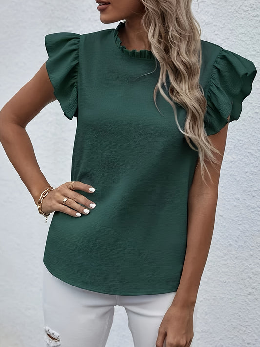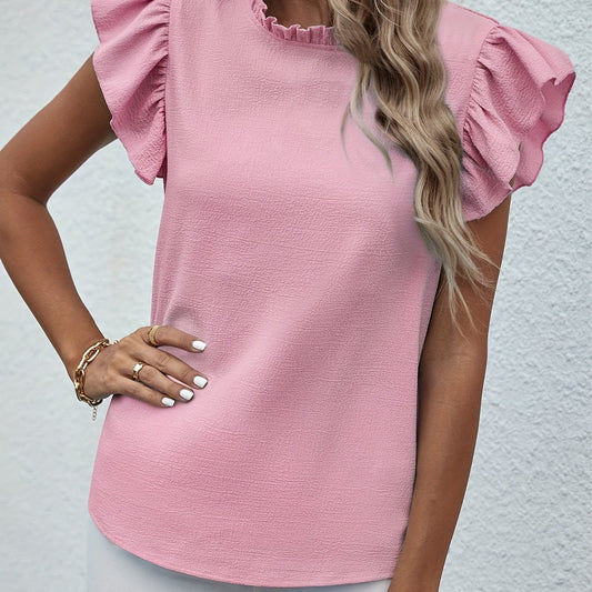 Ruffle Trim Round Neck Blouse, Casual Flutter Sleeve Blouse For Spring & Summer, Women's Clothing Wedding holiday vacation