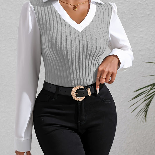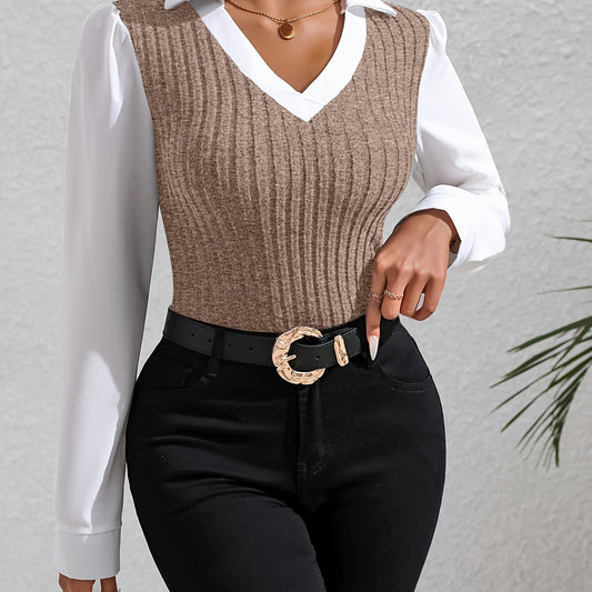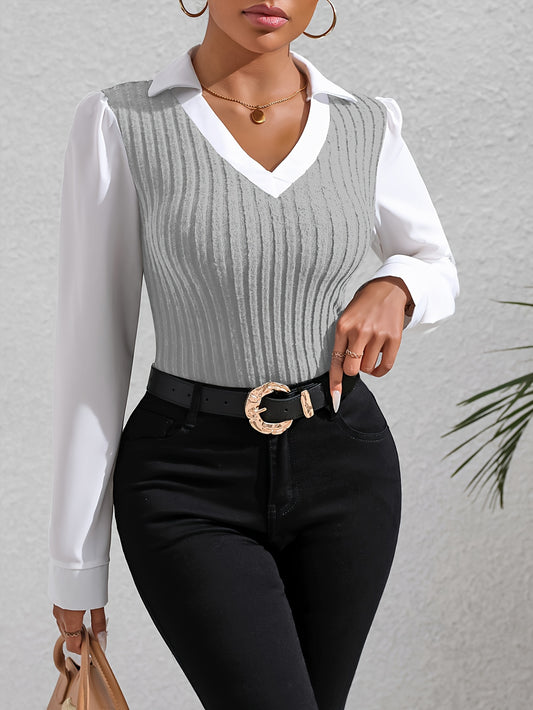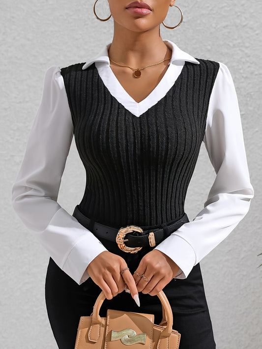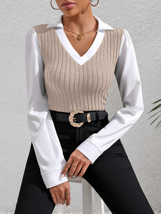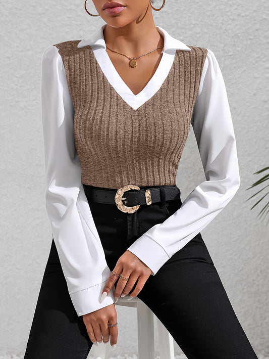 Color Block Faux Twinset Lapel Blouse, Casual Long Sleeve Blouse For Spring & Fall, Women's Clothing