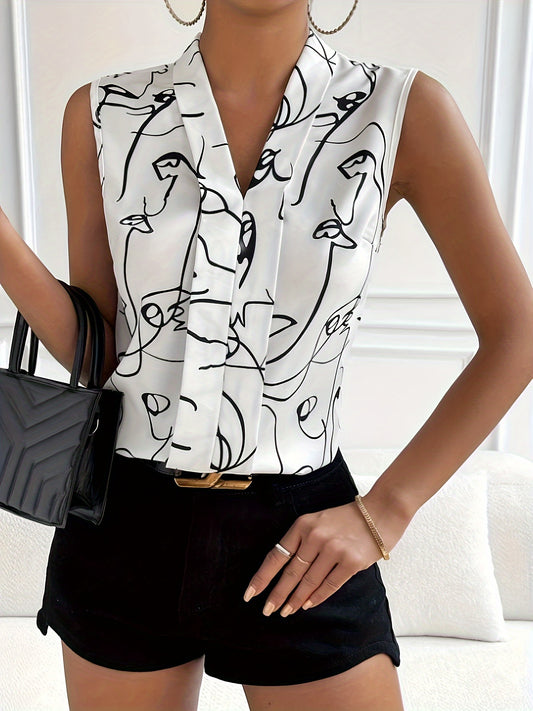 Graphic Print Tie Neck Blouse, Elegant Sleeveless Blouse For Spring & Summer, Women's Clothing