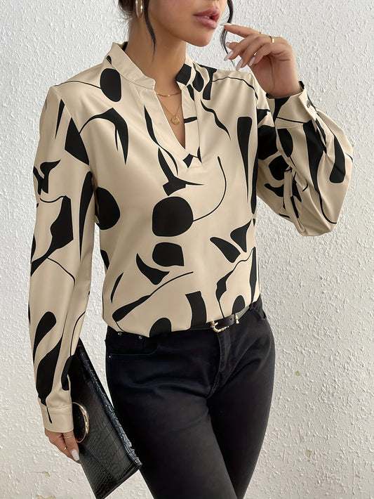 Geo Print V Neck Blouse, Casual Long Sleeve Blouse For Spring & Fall, Women's Clothing