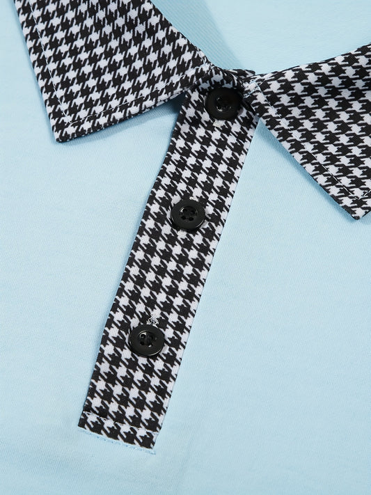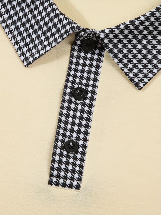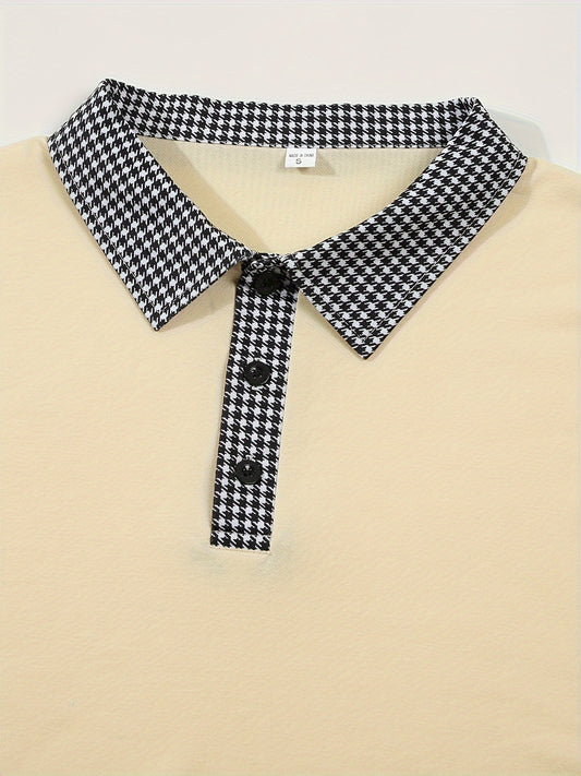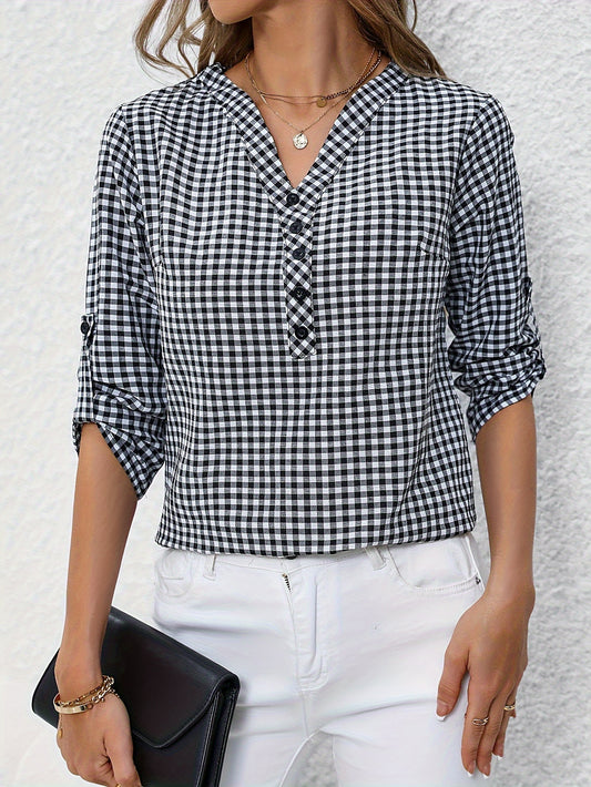 Plaid Print Button Notched Neck Blouse, Casual Rolled Sleeve Blouse For Spring, Women's Clothing