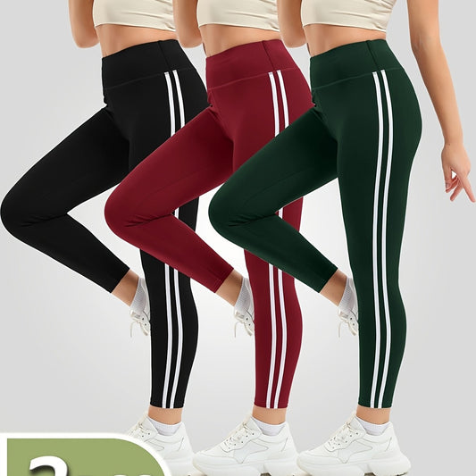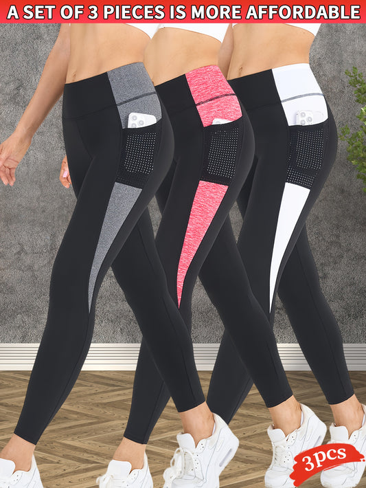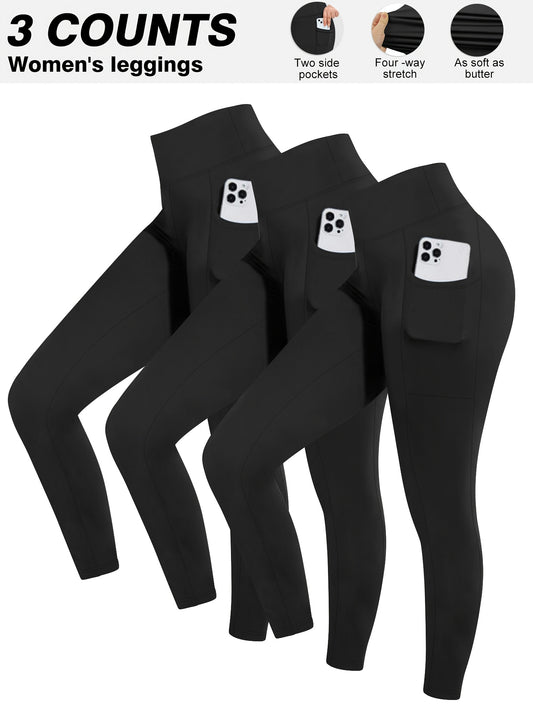 3pcs Set Women's High-Waisted Tummy Control Yoga Leggings - Full-Length Opaque Workout Pants with Pockets, 4-Way Stretch Soft Athletic Gym Pants for Running, Fitness, Yoga & Casual Attire - All-Season Tight Bodycon Leggings (