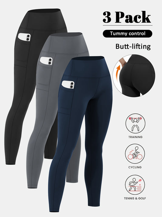 3pcs High-Waist Yoga Leggings with Pockets - Tummy Control, Slimming Effect, Stretchy & Breathable Fabric, Black/Brown/Gray, Perfect for Yoga & Casual Attire