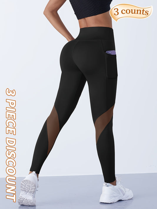 3pcs Women'S High-Waist Yoga Pants, Polyester & Spandex Blend, Sports Style, Solid Color, High Stretch, Breathable Mesh, with Pockets for All-Season Fitness Leggings