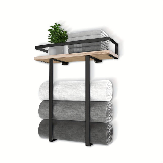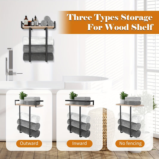 1pc Towel Racks For Bathroom Wall Mounted, Metal Towel Holder With Wooden Shelf For Folding Large Towels, Towel Storage For Small Bathroom Organizer Decor Or RV Camping, Black