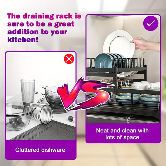 2-Tier Black Iron Kitchen Dish Rack - Large Capacity Organizer with Drainboard, Utensil Holder & Cup Hooks, Foldable Space-Saving Design for Plates, Bowls, Pots, Cutlery - Durable Powder-Coated Finish, Dish Drying Rack for Ki