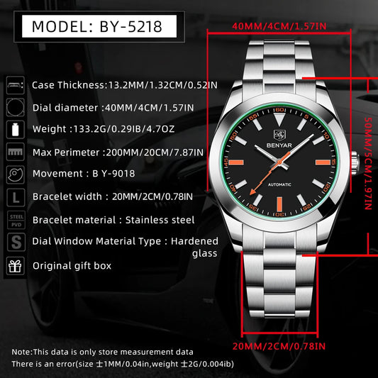 2025 New BENYAR Men's Watches Top Luxury Automatic Watch For Men Mechanical Wristwatches Stainless Steel Luminous Clock With Box