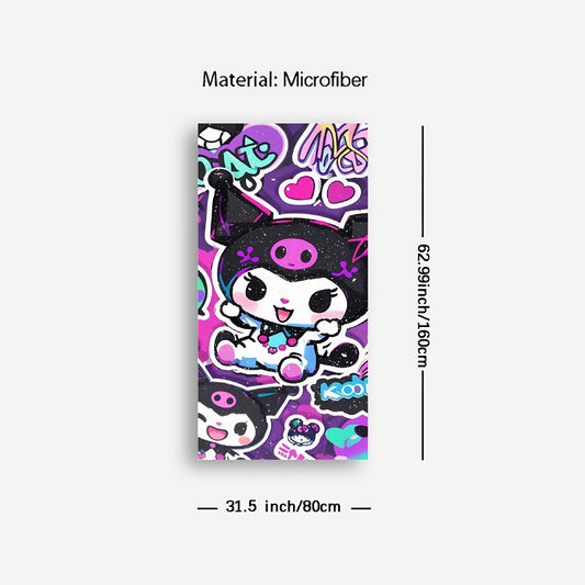 1pc Sanrio Kuromi Cartoon Beach Towel - Quick-Dry Microfiber Oversized Bath & Beach Towel with Vibrant Purple & Pink Anime Design, Hearts, Stars & Playful Phrases for Pool, Travel, Bath, Poolside Accessory, Playful Design, Qu