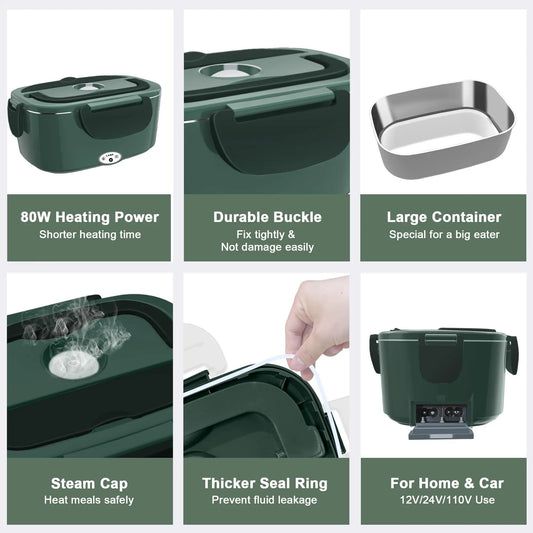 Portable Army Green Electric Lunch Box Stainless Steel Inner Pot Food-Grade PP Auto Feature for School Household Car Kids Dining