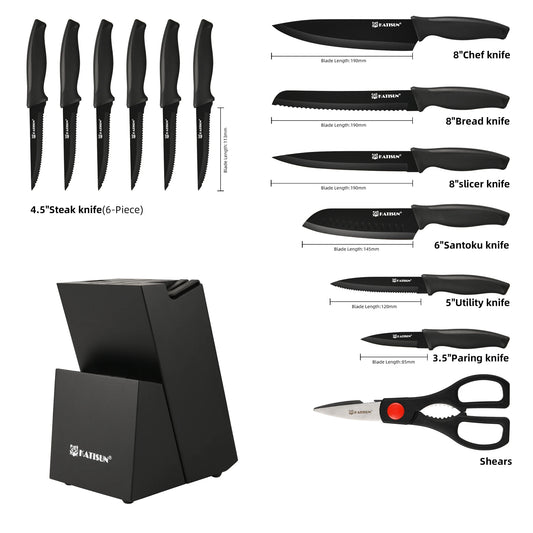 15-Piece Color Coded Kitchen Knife Set High Carbon Chef Knife Ergonomic Black Anti-Slip TPR Soft Handle and Inner Sharpener