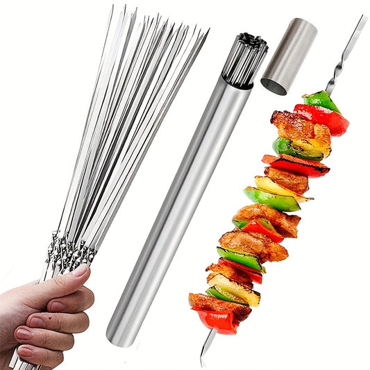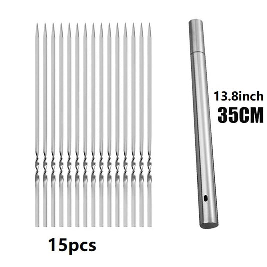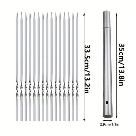 15pcs Stainless Steel Skewers & 1 Tube Storage For Barbecue, Reusable Grill Skewers, Shish Kebab BBQ Camping Flat Forks Gadgets, Outdoor Camping Picnic, Cookware Barbecue Tool Accessories