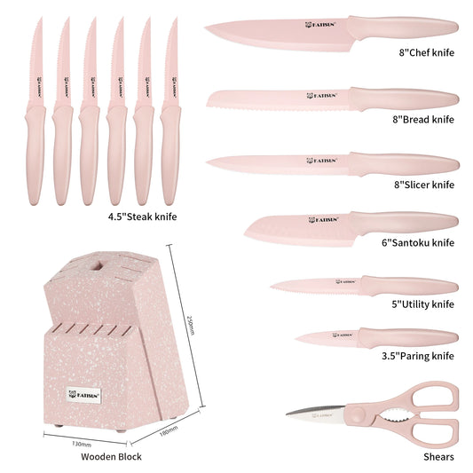 14 Pieces Pink Coding High Carbon Steel Blade, No Rust, and Super Sharp Knife Set with Wooden Stand and Kitchen Scissors