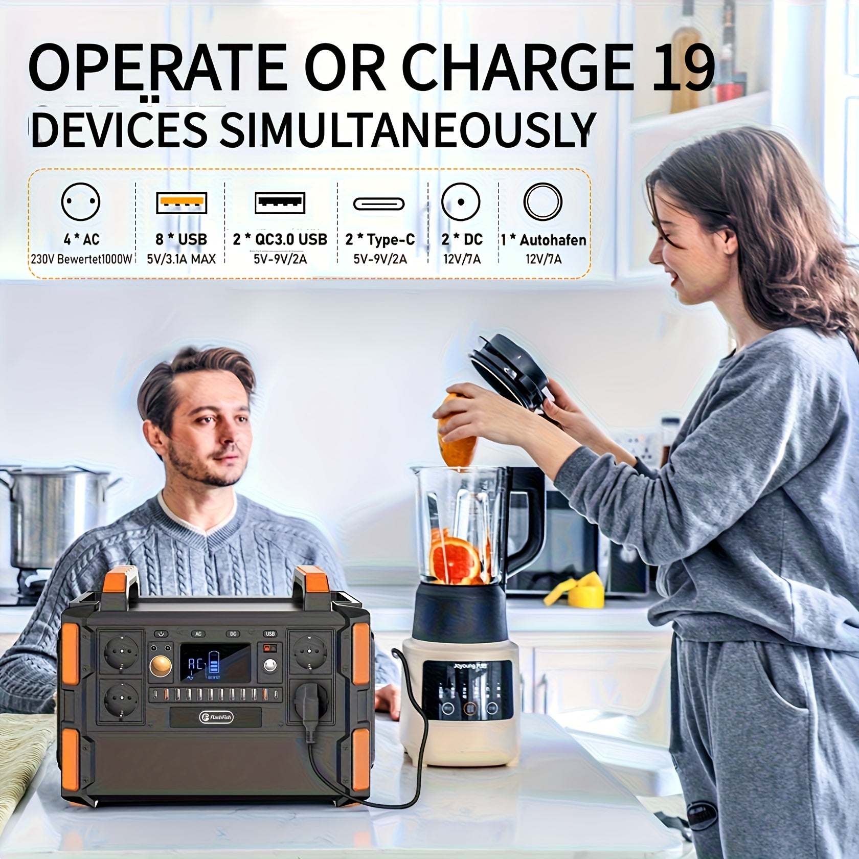 1000W Lifepo4 Battery Solar Power Generator 1041.6Wh 230V (2000W Surge) Emergency LFP Battery Power Generator with 4*AC Solar Power Station, 19 output socket Portable Power Station for Emergency/Outdoor camping/RV/Home/Comput