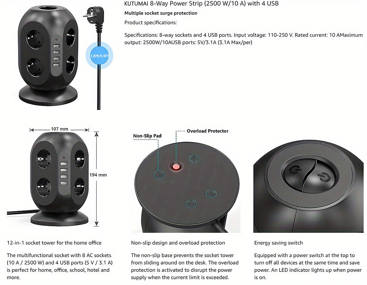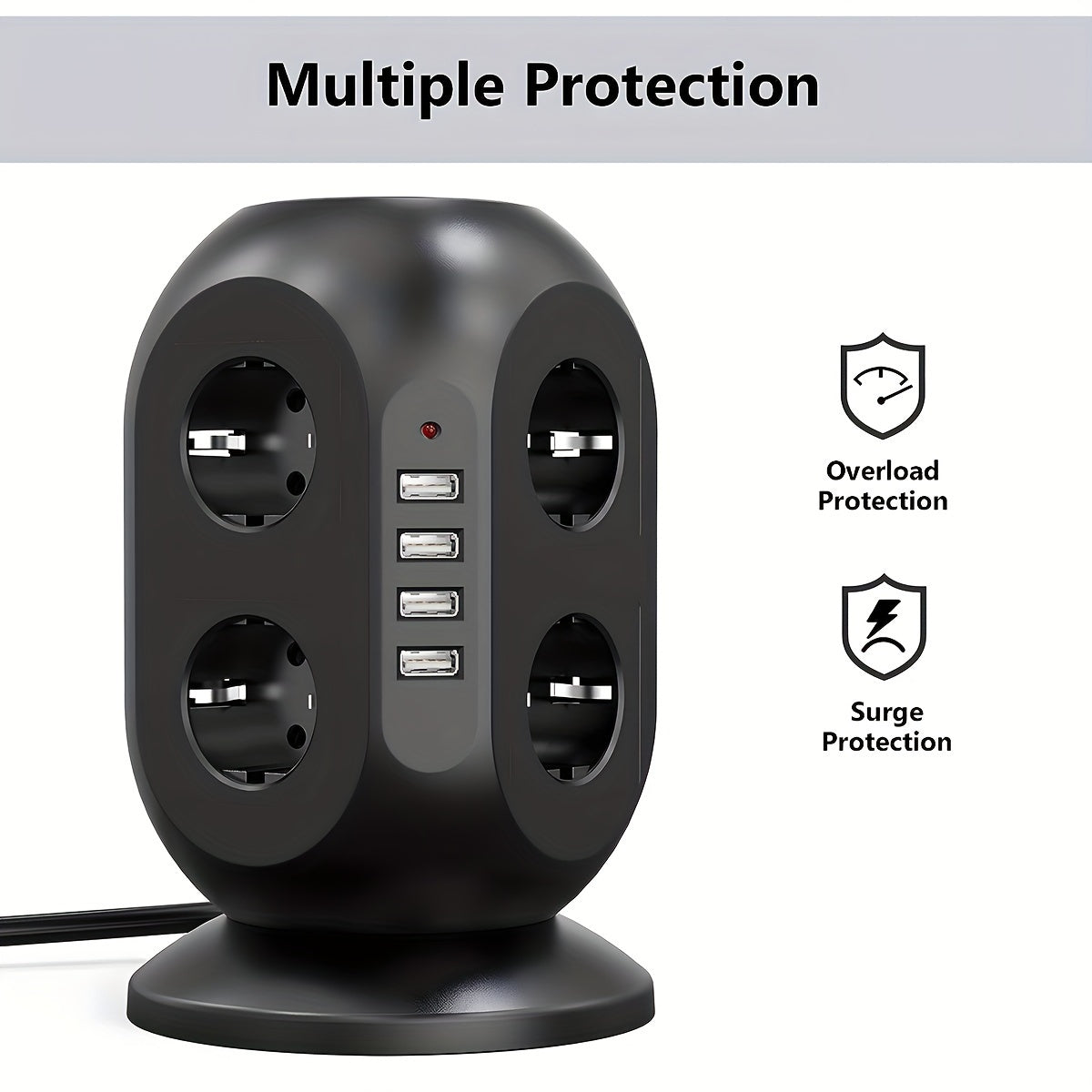 12-way power strip with 4 USB, multi-socket tower, 1.8m extension cable, power strip with double for Switch, desktop socket tower surge protection for garden, office, kitchen