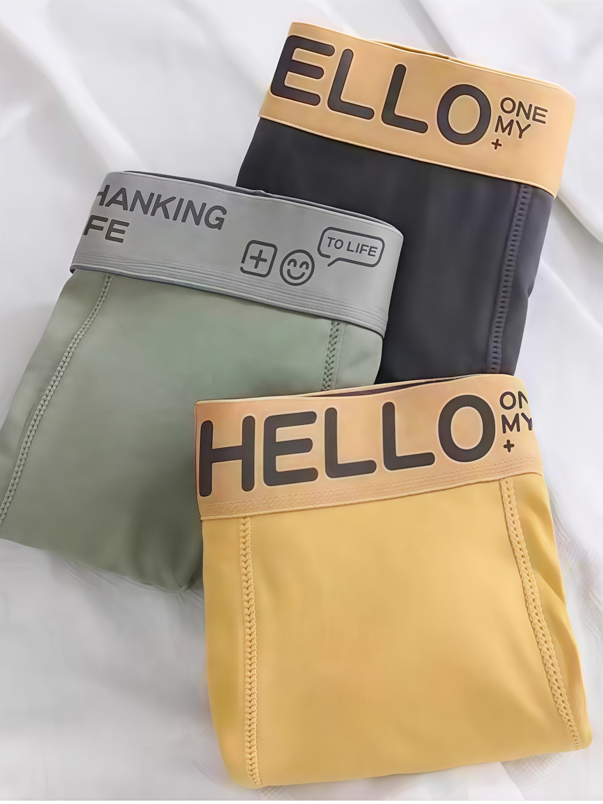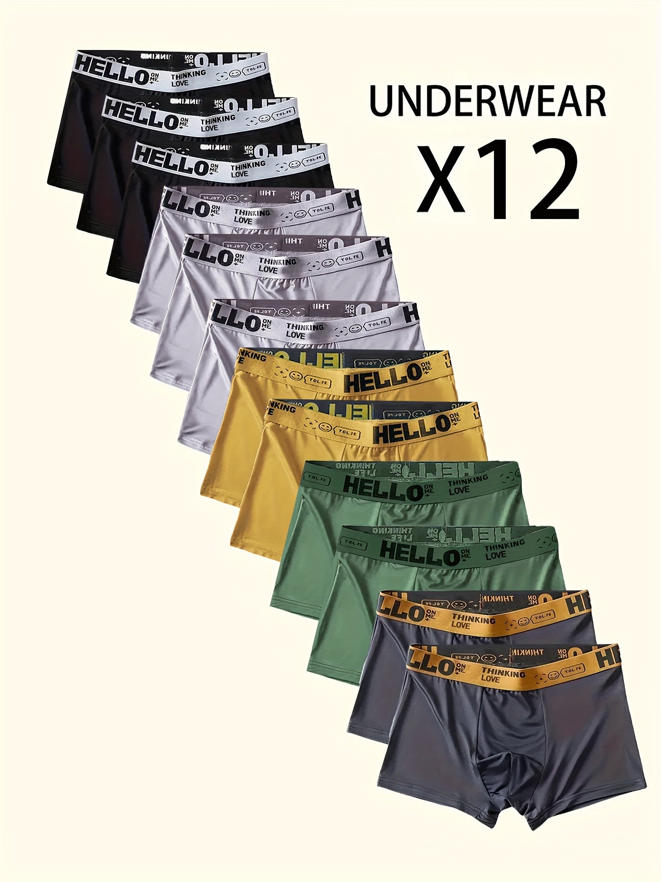 12pcs Men's Boxer Briefs, HELLO Letter Waistband, Breathable Soft Casual Fashion Sports Underwear, Plus Size Boxers for Men, Pouch Boxer, White Boxer Briefs for Men, Daily Essentials, Active Lifestyle, Letter Print, Sleek Wai