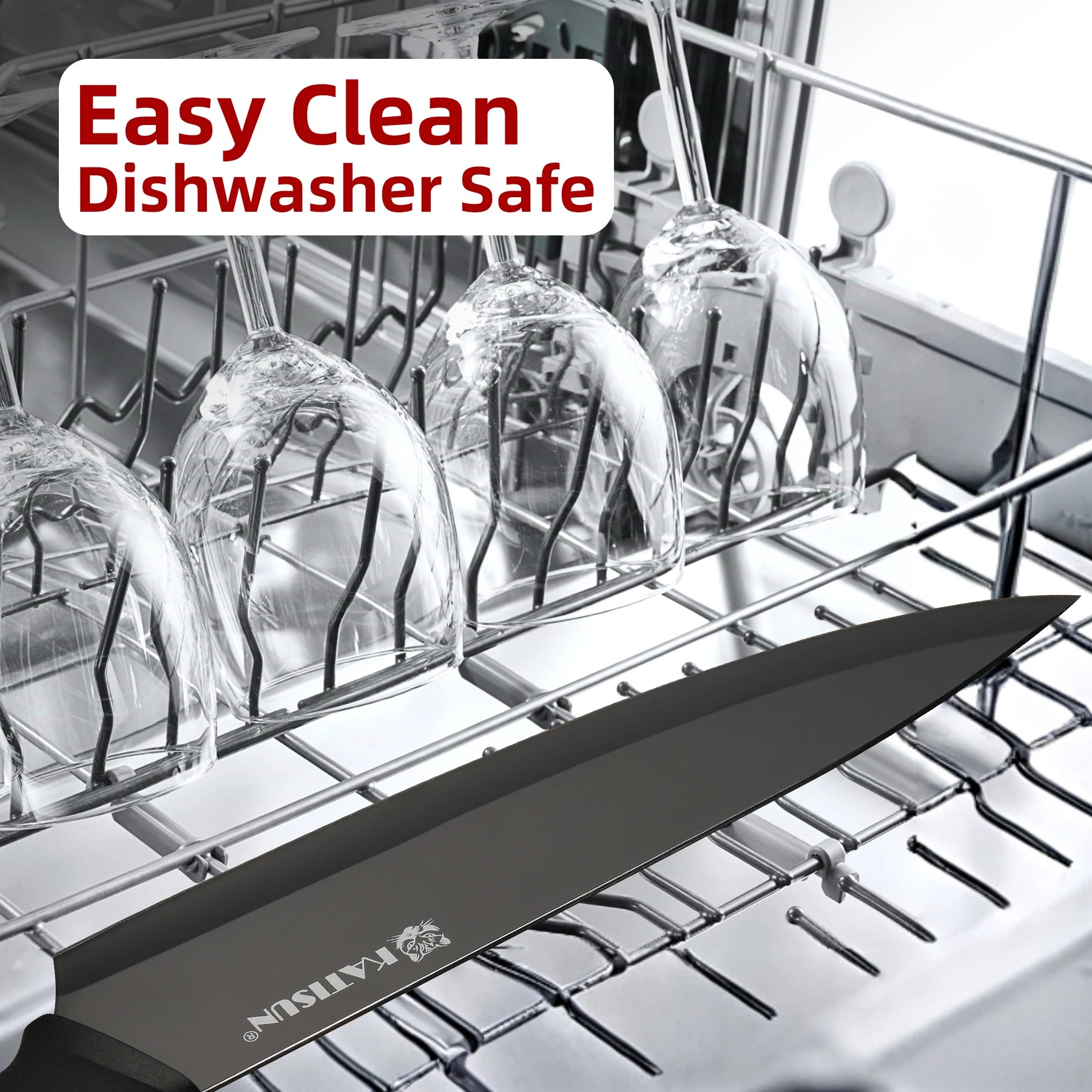 - ALL-IN-ONE COMPLETE SET - This professional kitchen knife set with Non-stick coating includes an 8'' chef's knife, 8" Bone Knife, 8" Bread Knife, 7" Santoku Knife, 5" Utility Knife, 3.5" Paring Knife, six 4.5" Steak Knives, Kitchen Scissors (with soda pump), a knife sharpener, all neatly organized in a beautiful 13 slots wood block.