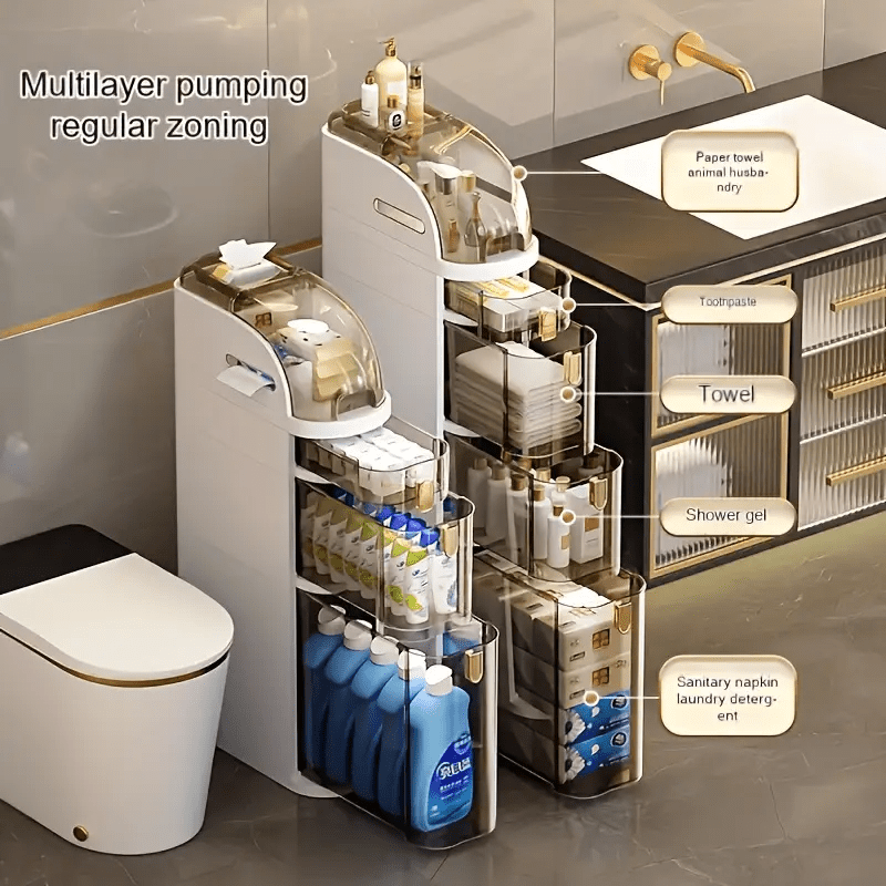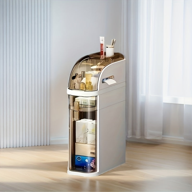 1 unidade de Armário de Canto Slim Branco e Dourado de Grande Capacidade com Gavetas e Portas Transparentes – Organizador Independente de Plástico Reforçado com Rodas, ideal para Casa de Banho, Quarto e Cozinha – Unidade de Prateleiras Moderna e Compacta que Poupa Espaço. A venda na Bmaxstore online.