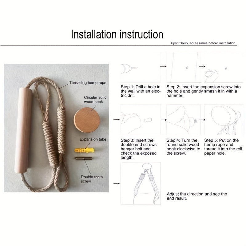 1pc LDQ Hemp Rope Paper Towel Holder, Solid Wood Rope Weaving, Fragrance-Free Fabric Towel Storage Rack, Creative No-Punch Wall-Mounted Roll Paper Holder