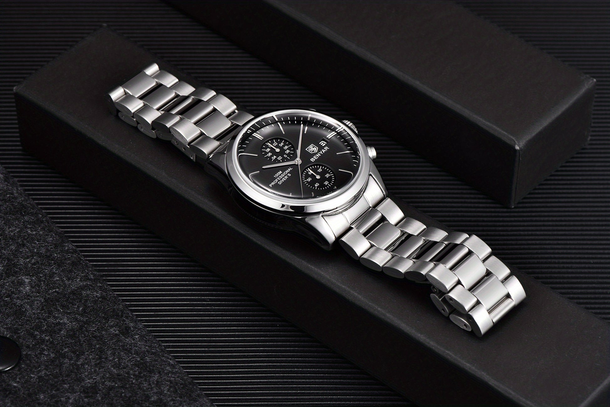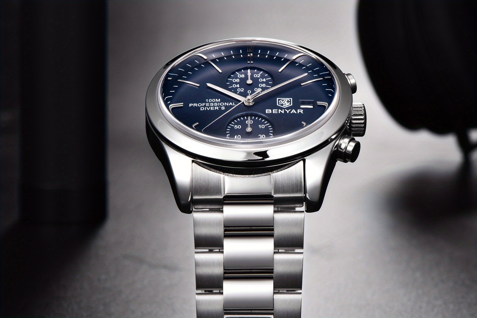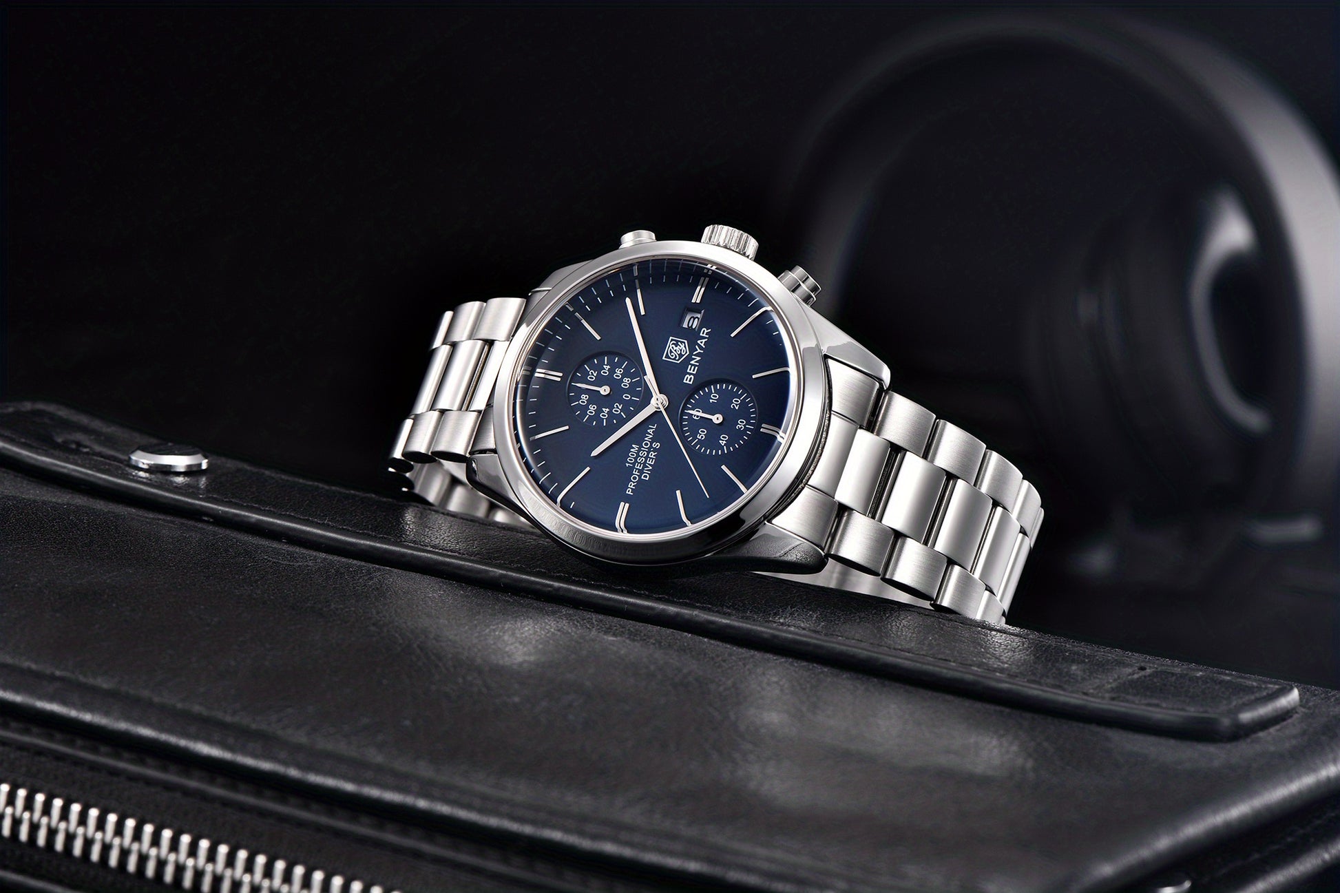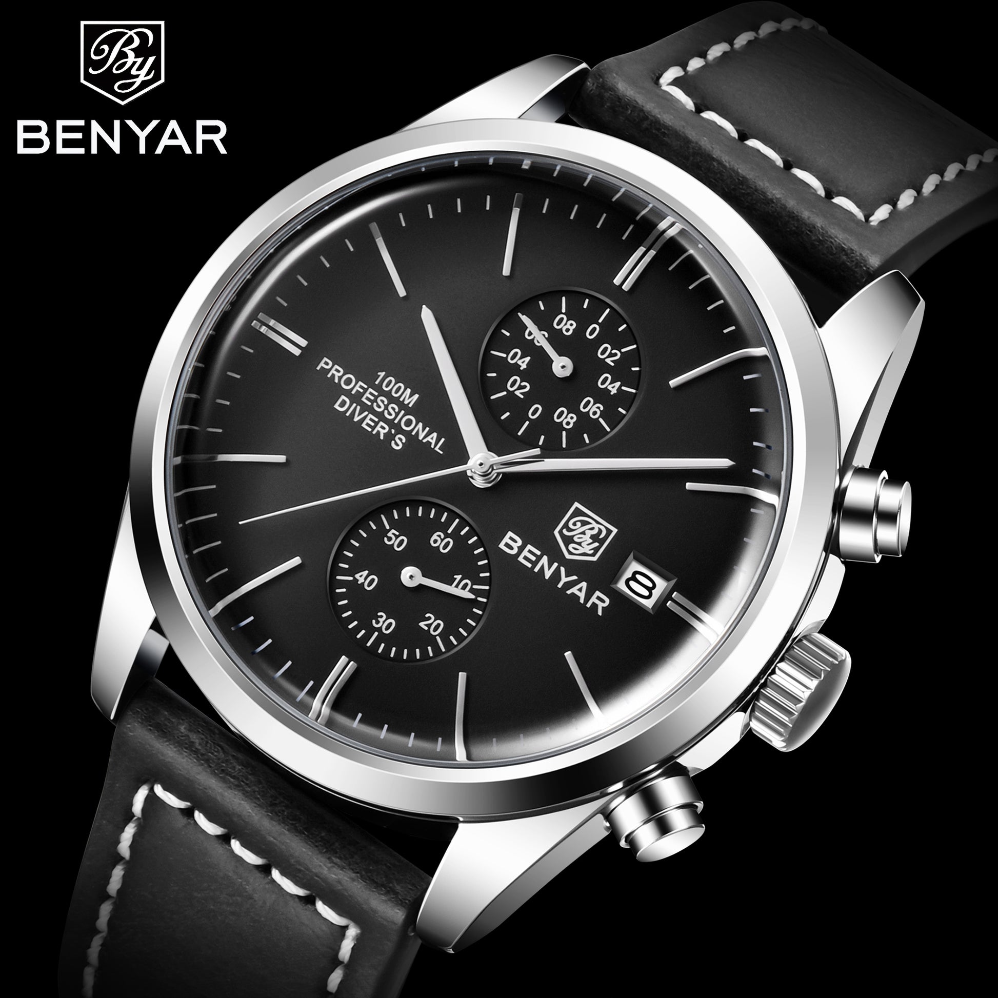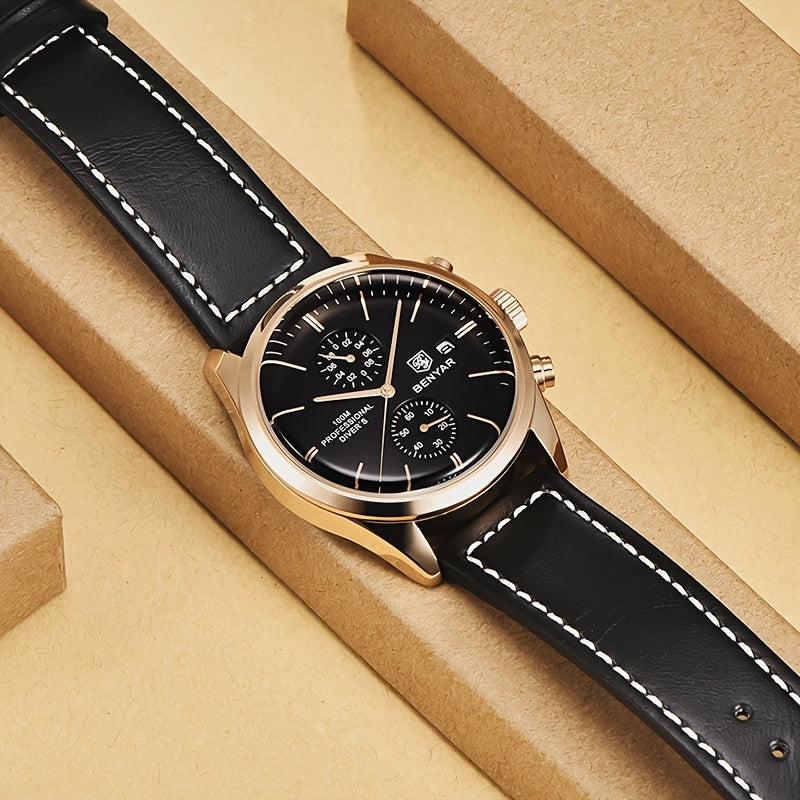 1pc New BENYAR Men's PU Leather Quartz Wristwatch, Men's 100M Multifunctional Watch Military Sports Chronograph Watch For Men