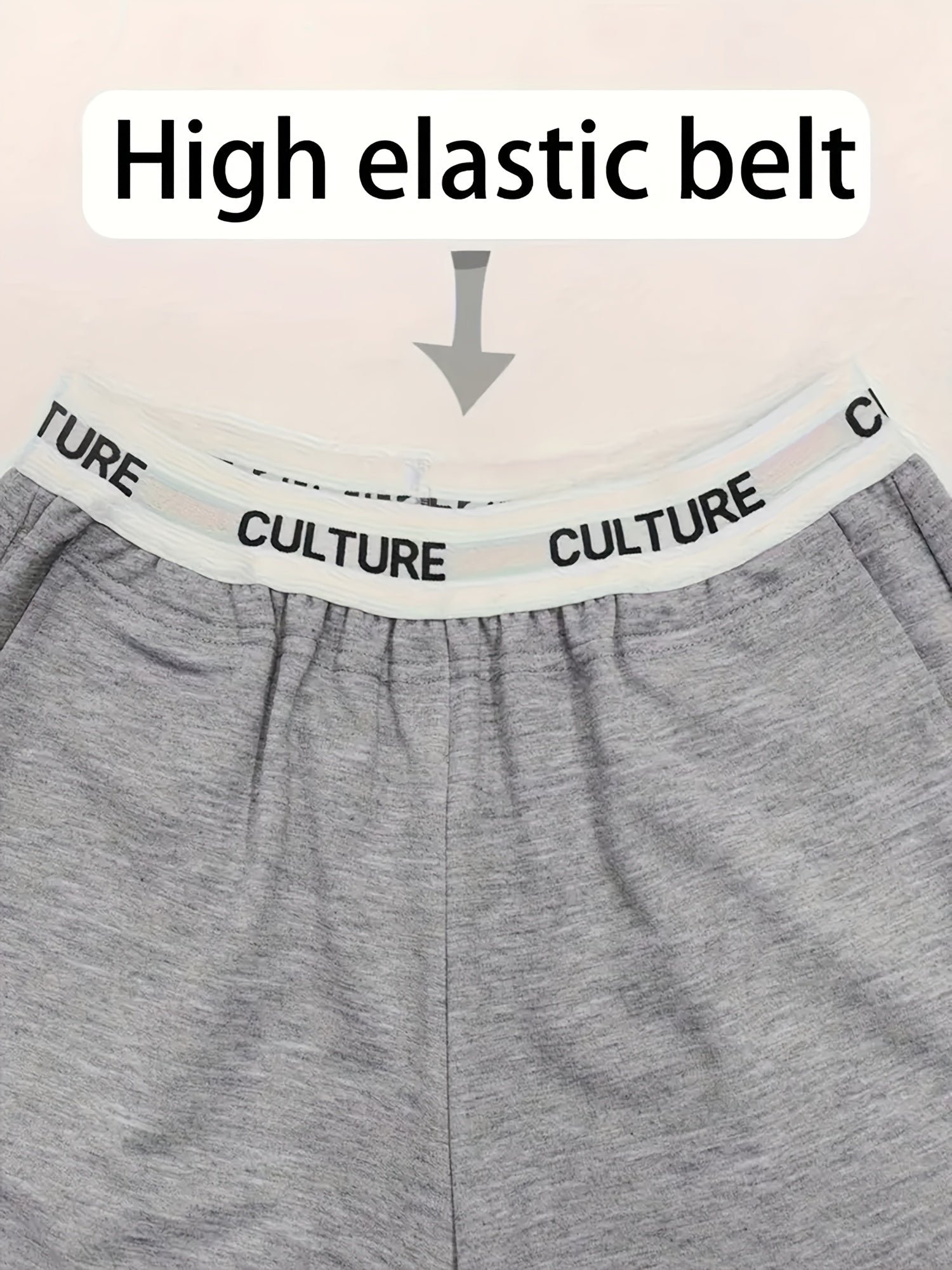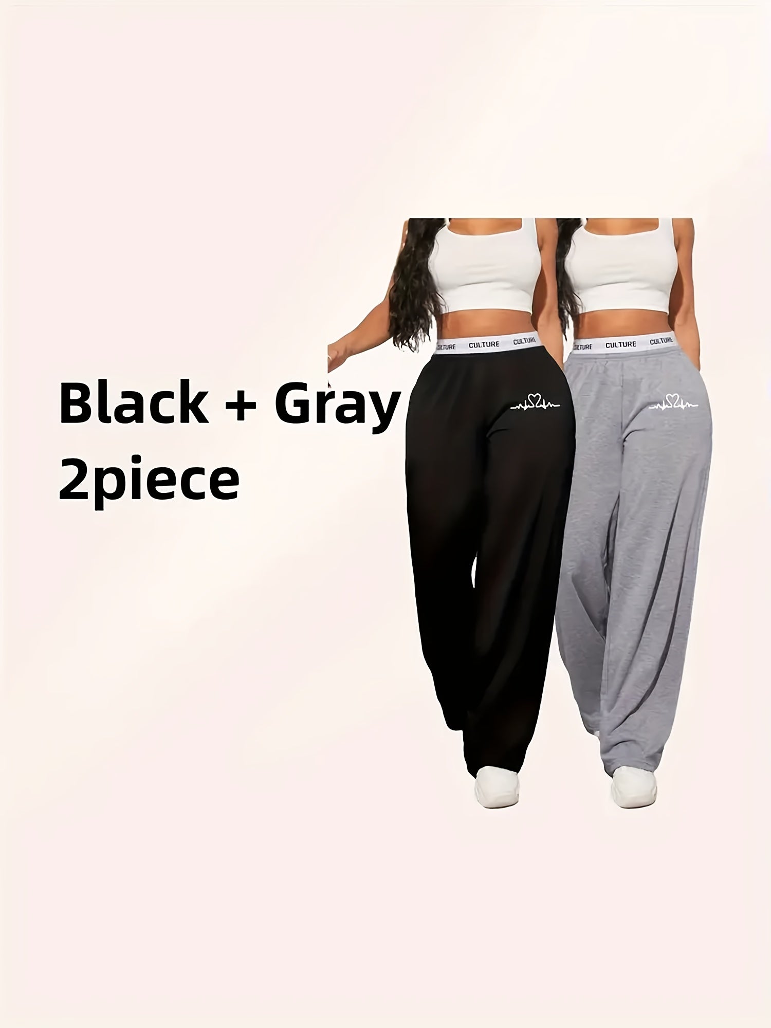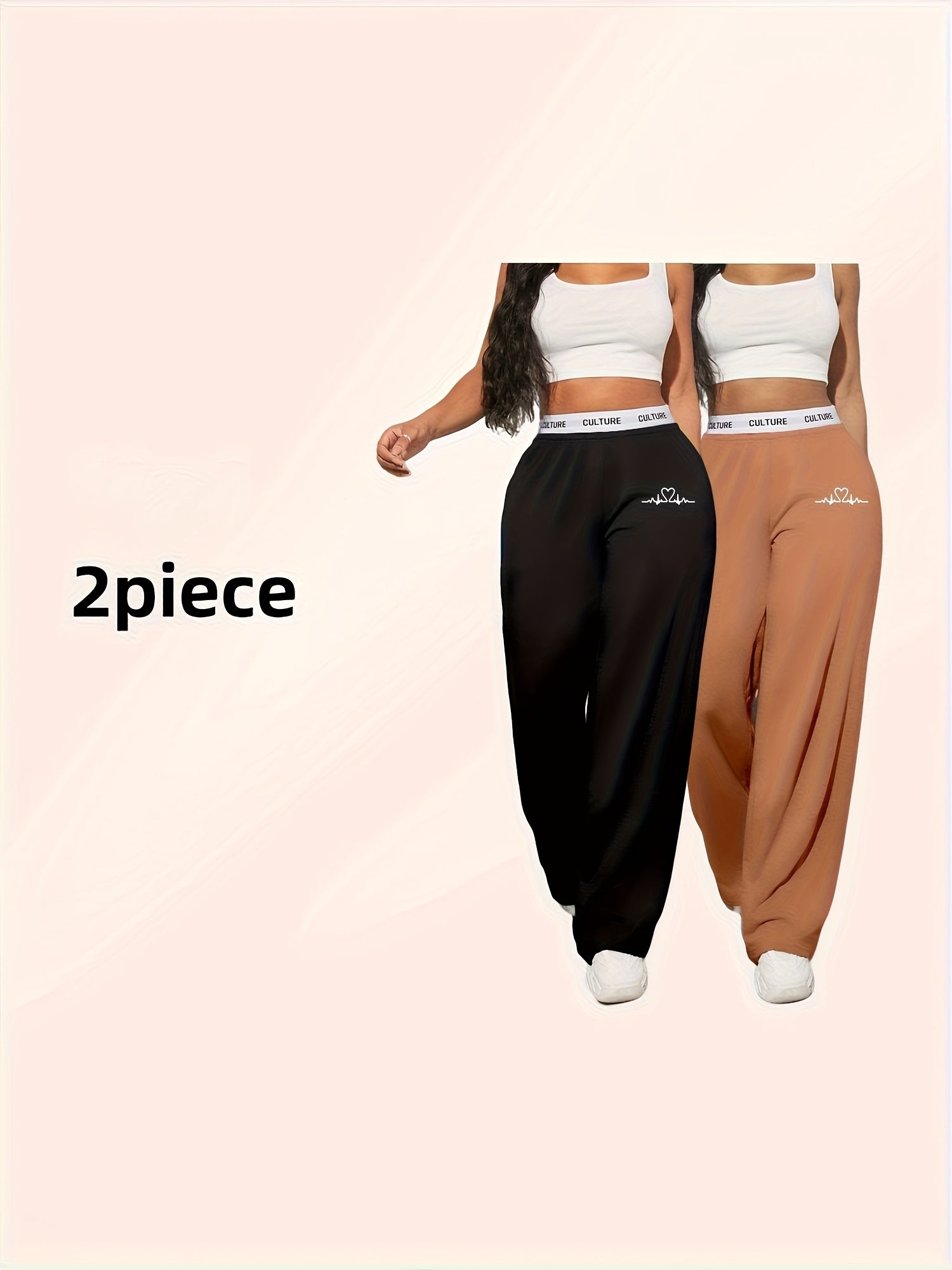 2pcs Women'S High-Waisted Wide-Leg Pants with Heart Letter Print - Casual Loose-Fit Joggers, Solid Color, All-Season Comfort, Pockets, Versatile for Casual Attire