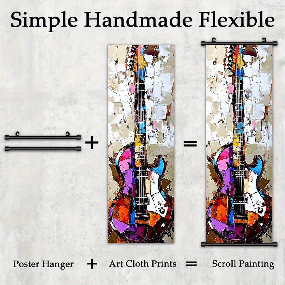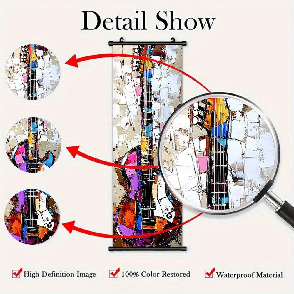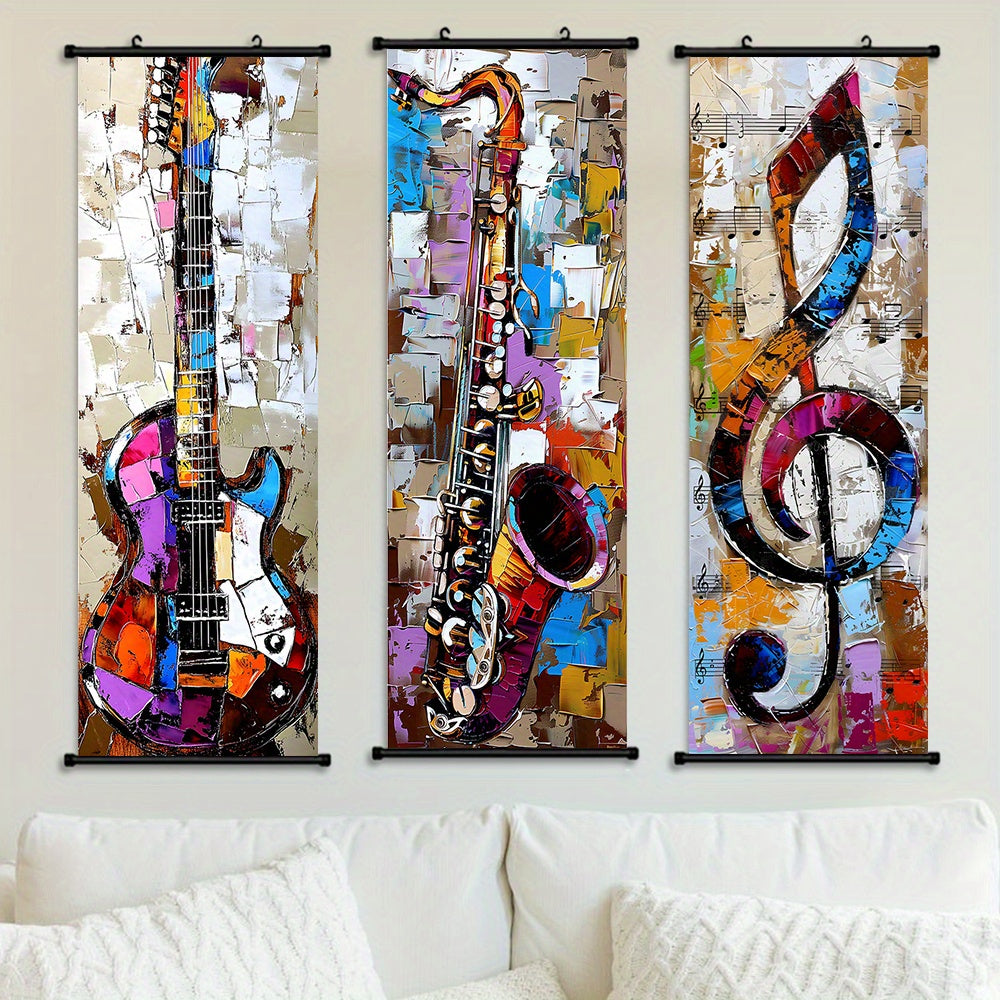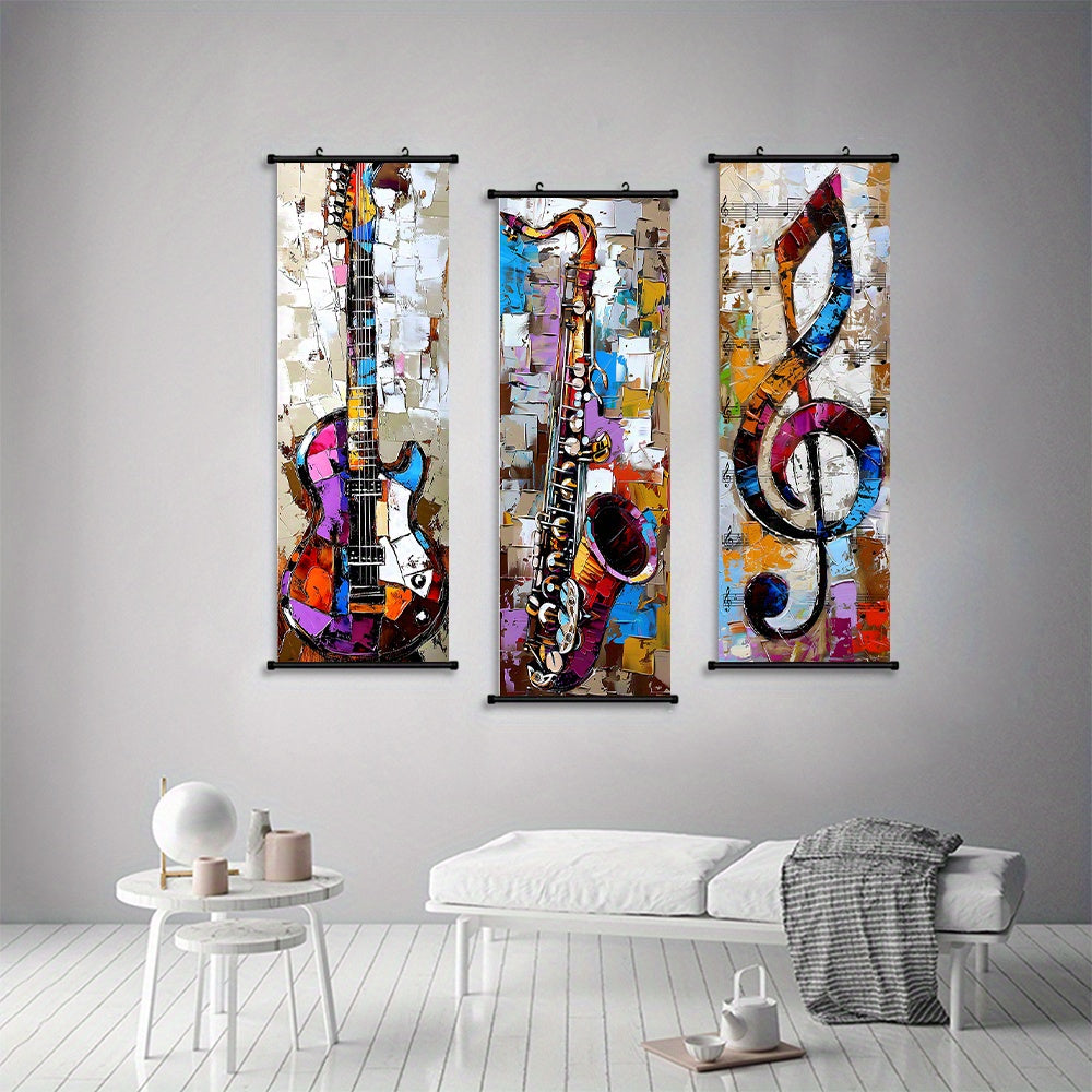 - 3pcs Vibrant Music Hanging Scroll Painting Set Showcasing Notes, Guitar and Saxophone Art, Artwork Wall Art Bathroom Bedroom Living Room Wall Decor, Home Decor, Aesthetic Room Decoration