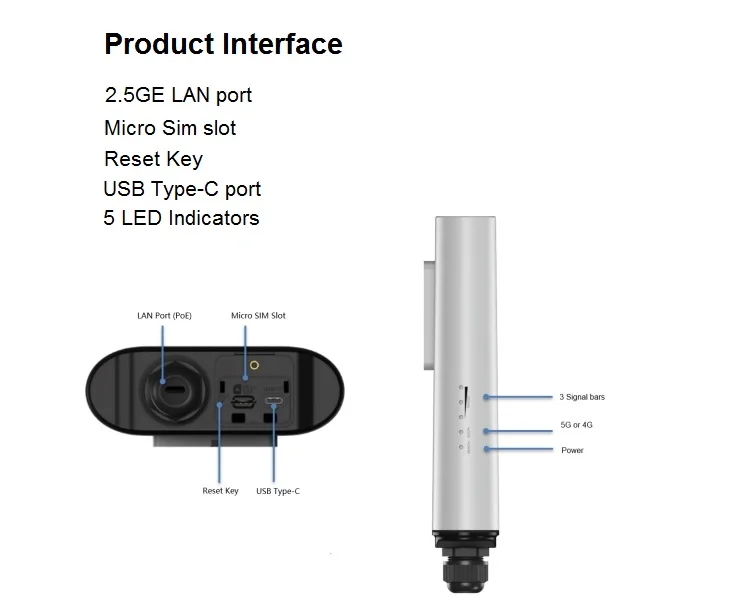 1x 2.5GE (PoE 802.3AT) / 1x USB-C / 1x Micro SIM slot / 1x Reset key / 1x ESIM (Optional)