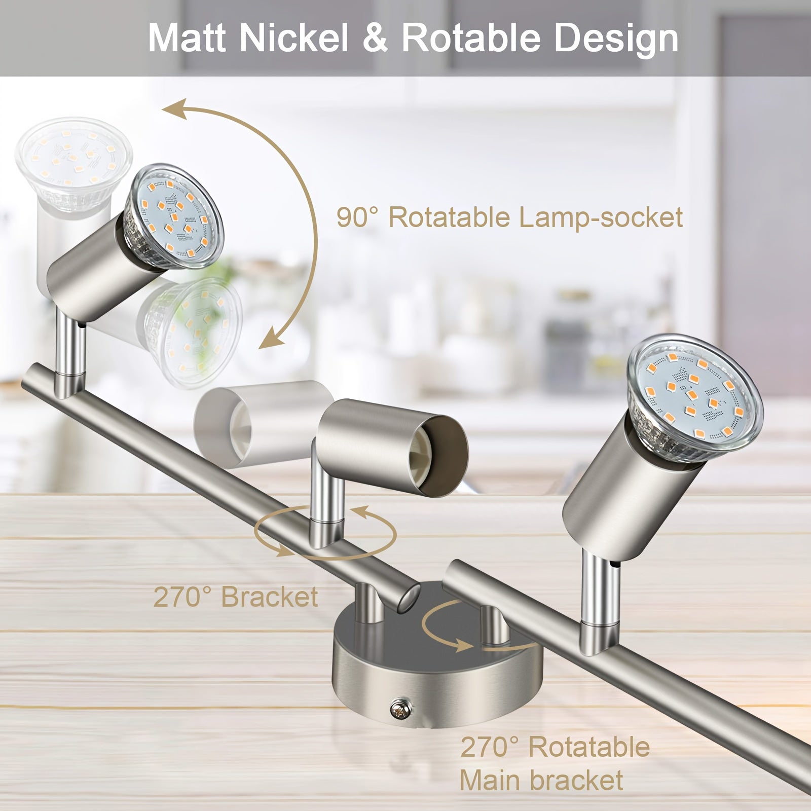 AMANSOUR Modern 4-Flame LED Ceiling Light, 330° Rotatable Spotlight, Semi Flush Mount, Matte Nickel, Cast Iron, Switch Control, Hard-Wired 110-240V, for Kitchen, Living Room, Bedroom - No Bulbs Included