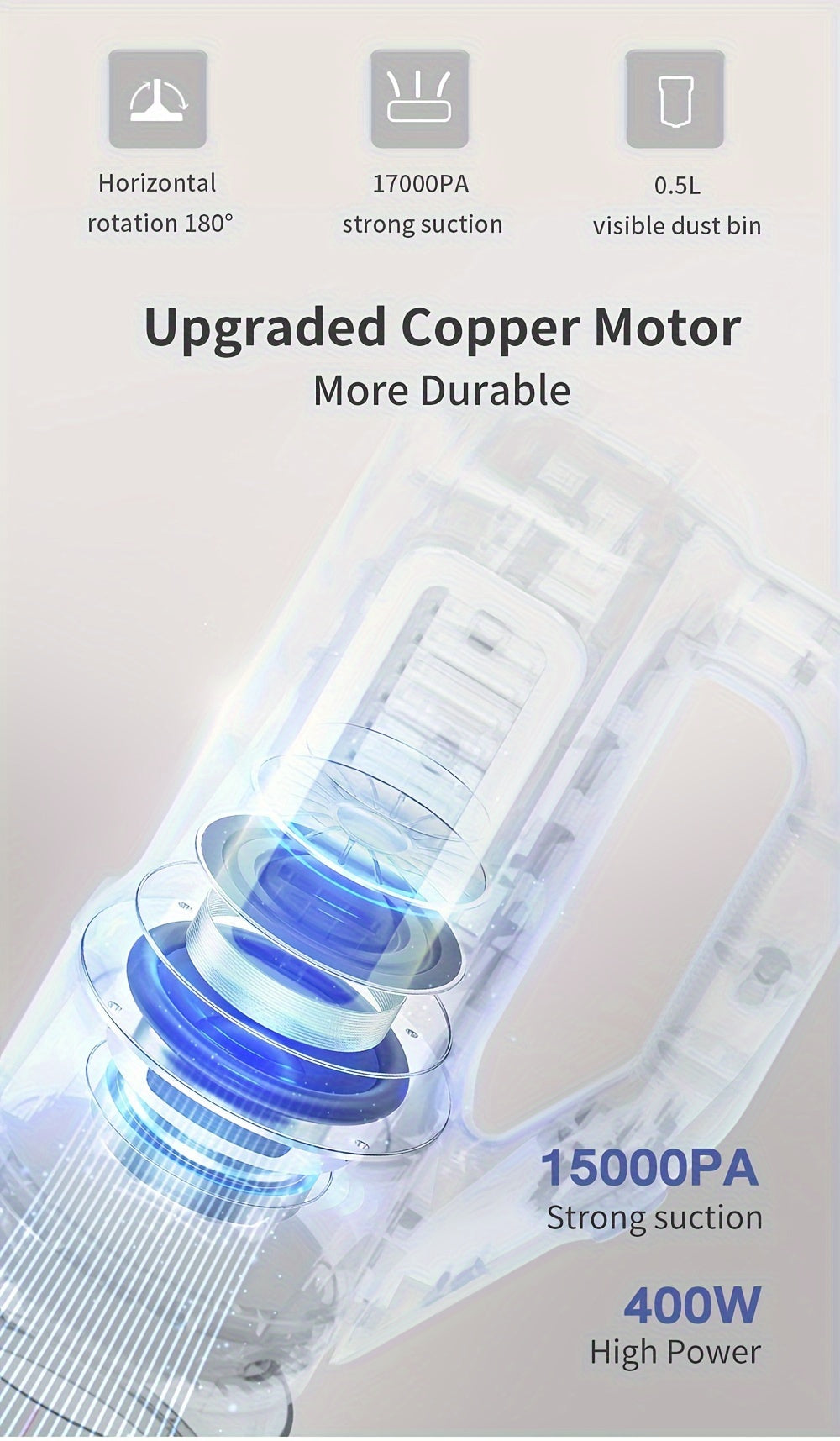 O depósito de 0,5L permite limpar mais sem interrupções, enquanto o filtro duplo (Dual-Action) garante uma filtragem eficaz e ar mais limpo. O cabo longo de 4 metros proporciona liberdade de movimento, e o bico 2 em 1 incluído facilita o acesso a zonas difíceis.