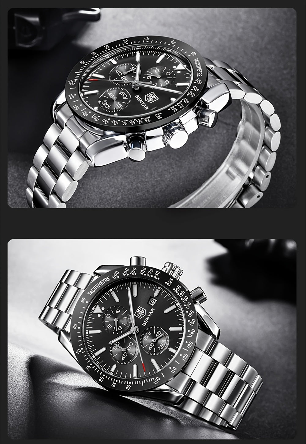 BY BENYAR Men'S Quartz Chronograph Watch - Luminous, Stainless Steel, Blue Dial with Date & Stopwatch, Faux Leather Strap, Elegant Business & Casual Style, Perfect Gift for Men, Professional Chronograph | Sleek Watch Design |