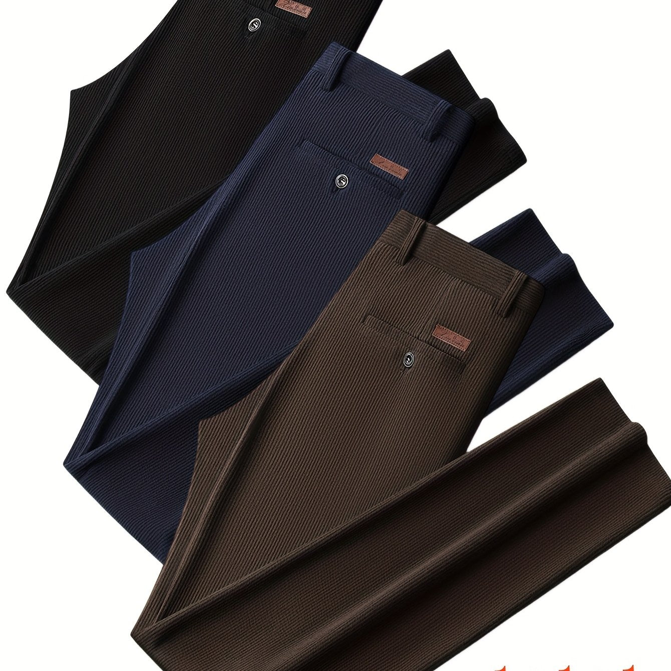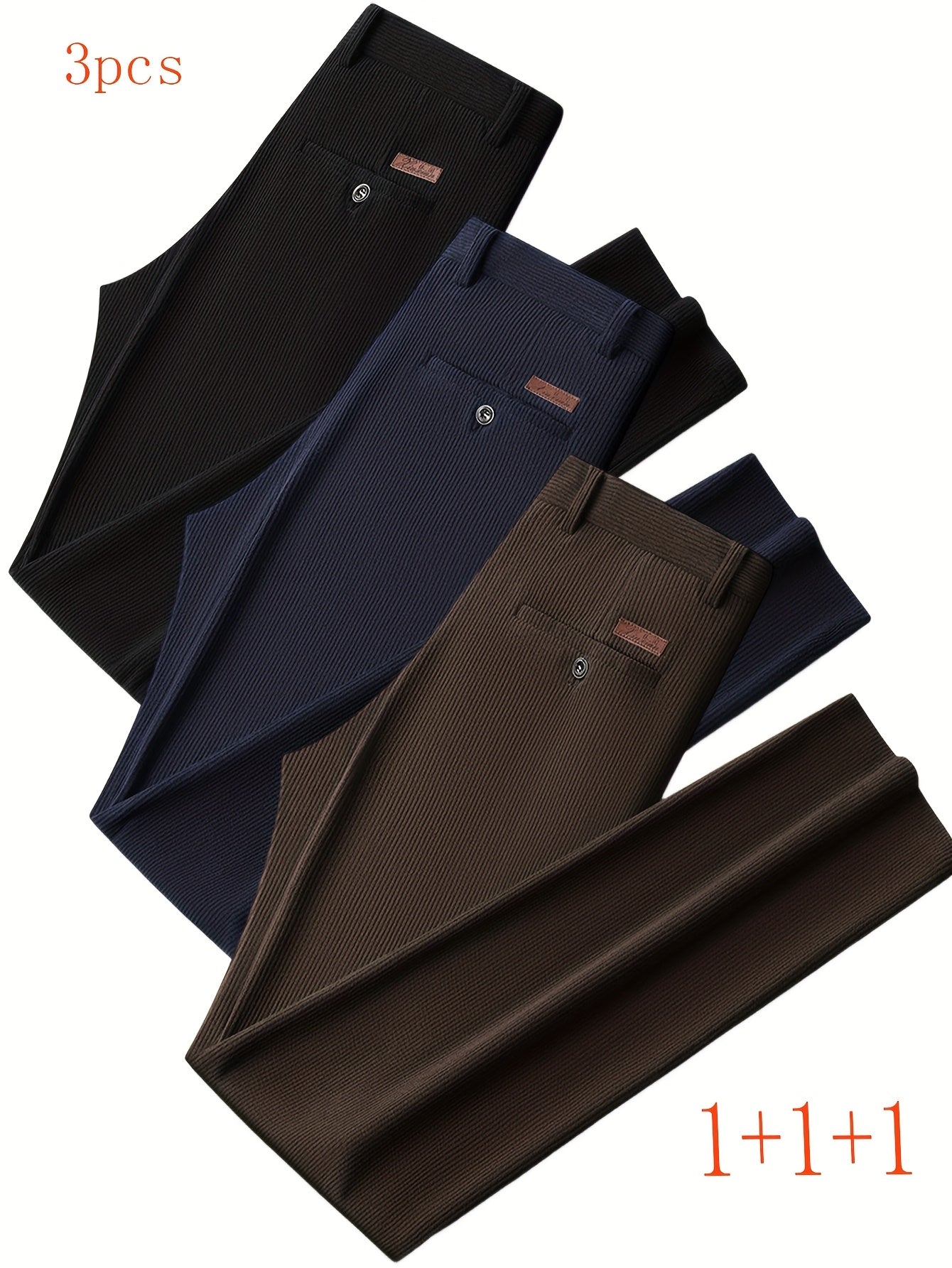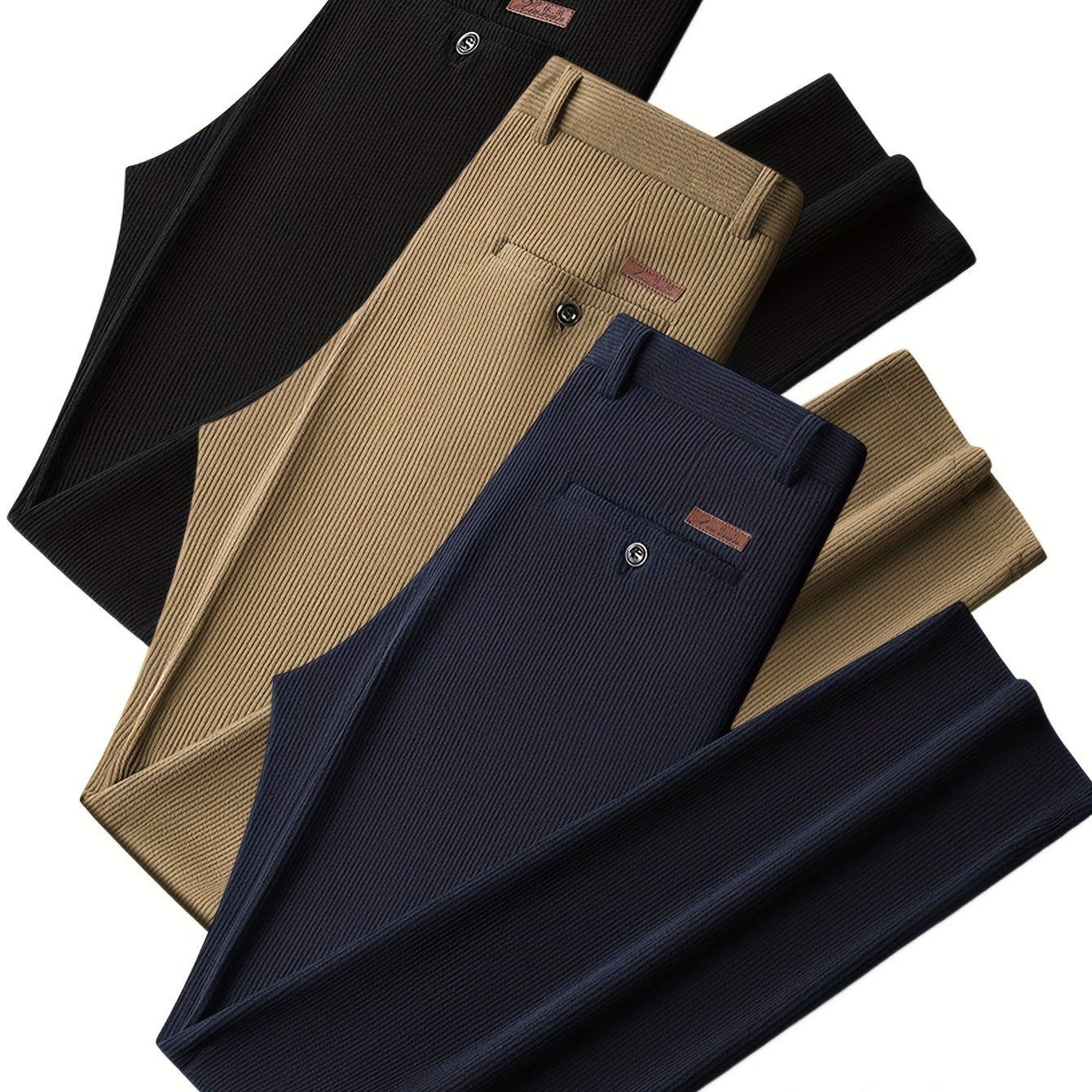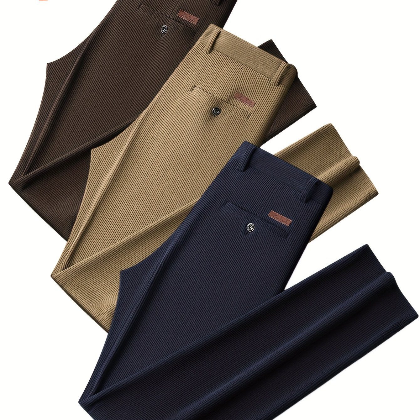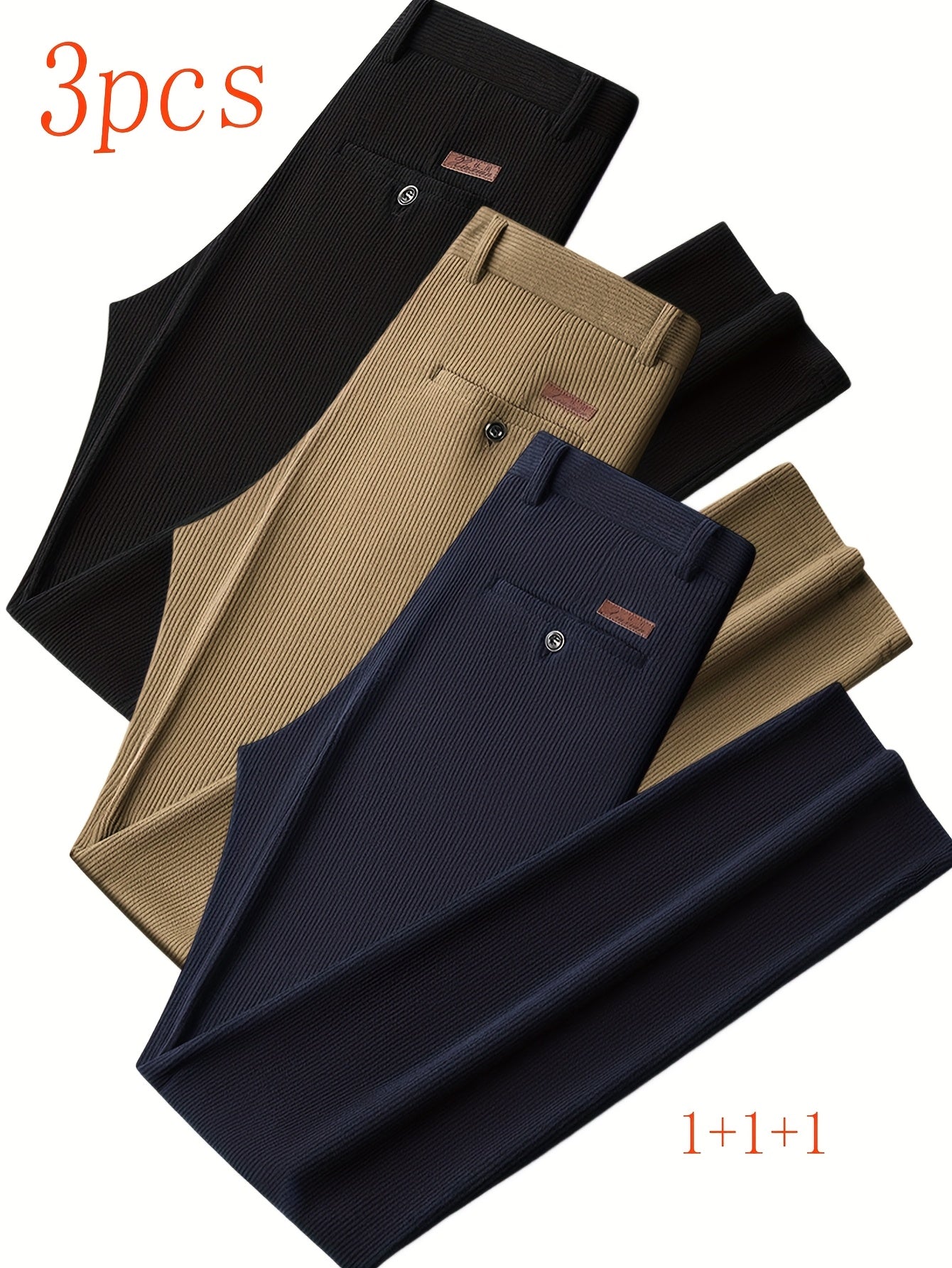 Renove o seu guarda-roupa com este conjunto de 3 calças masculinas em veludo cotelê, perfeitas para o outono e inverno. Ideais para um visual casual, semi-formal ou de negócios, estas calças combinam estilo, conforto e versatilidade em qualquer ocasião.
