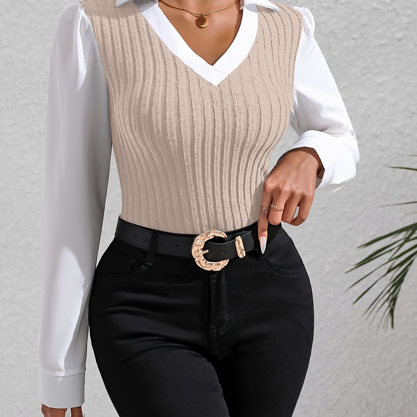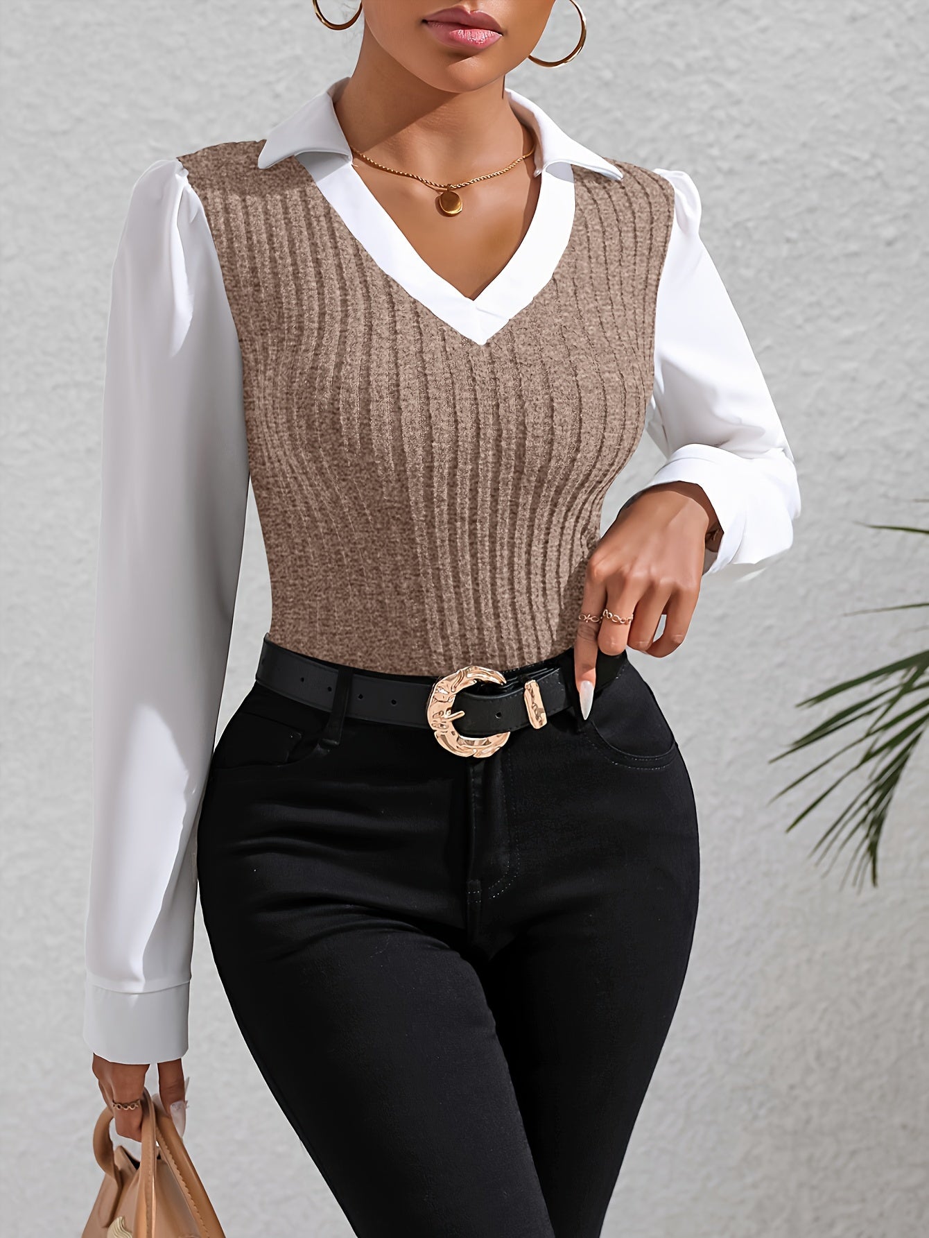 Color Block Faux Twinset Lapel Blouse, Casual Long Sleeve Blouse For Spring & Fall, Women's Clothing