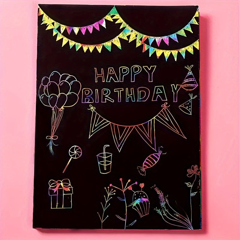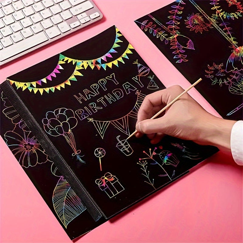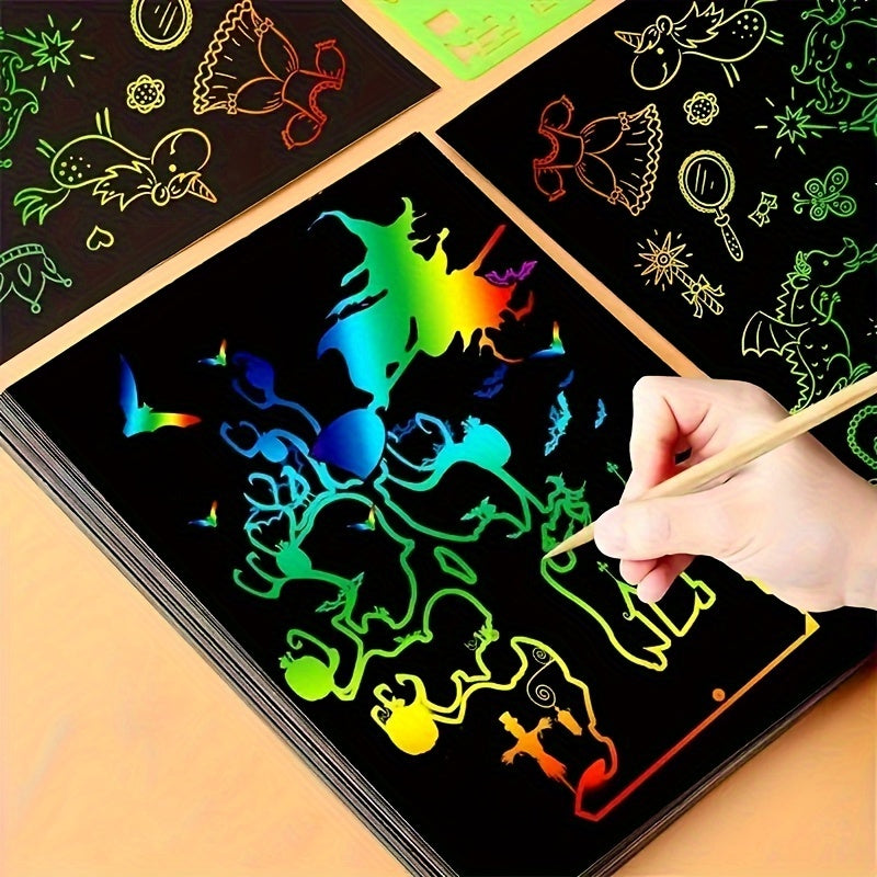Conjunto 50 Folhas Mágicas Scratch com 5 Canetas de Bambu — Kit de Arte Arco-Íris para Desenhos e Pintura Raspável, Presente Criativo para Festa, Halloween e Natal