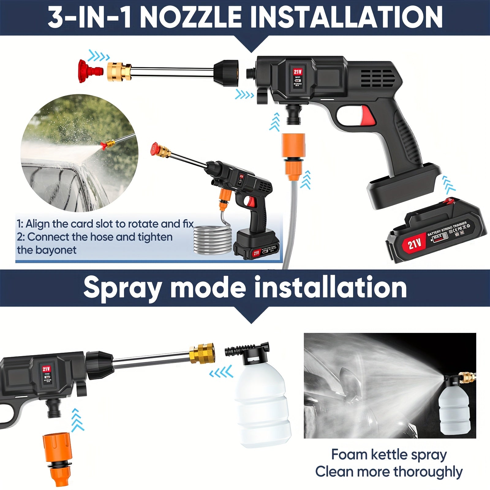 Cordless High Pressure Cleaning Gun Self-priming Continuous Spray Foam Water Gun, 5m Hose & 2 Rechargeable Lithium Battery, 3in 1 Nozzle, Electric Portable Washer Machine, Suitable for Washing Cars, Clean The Garden & Floor A