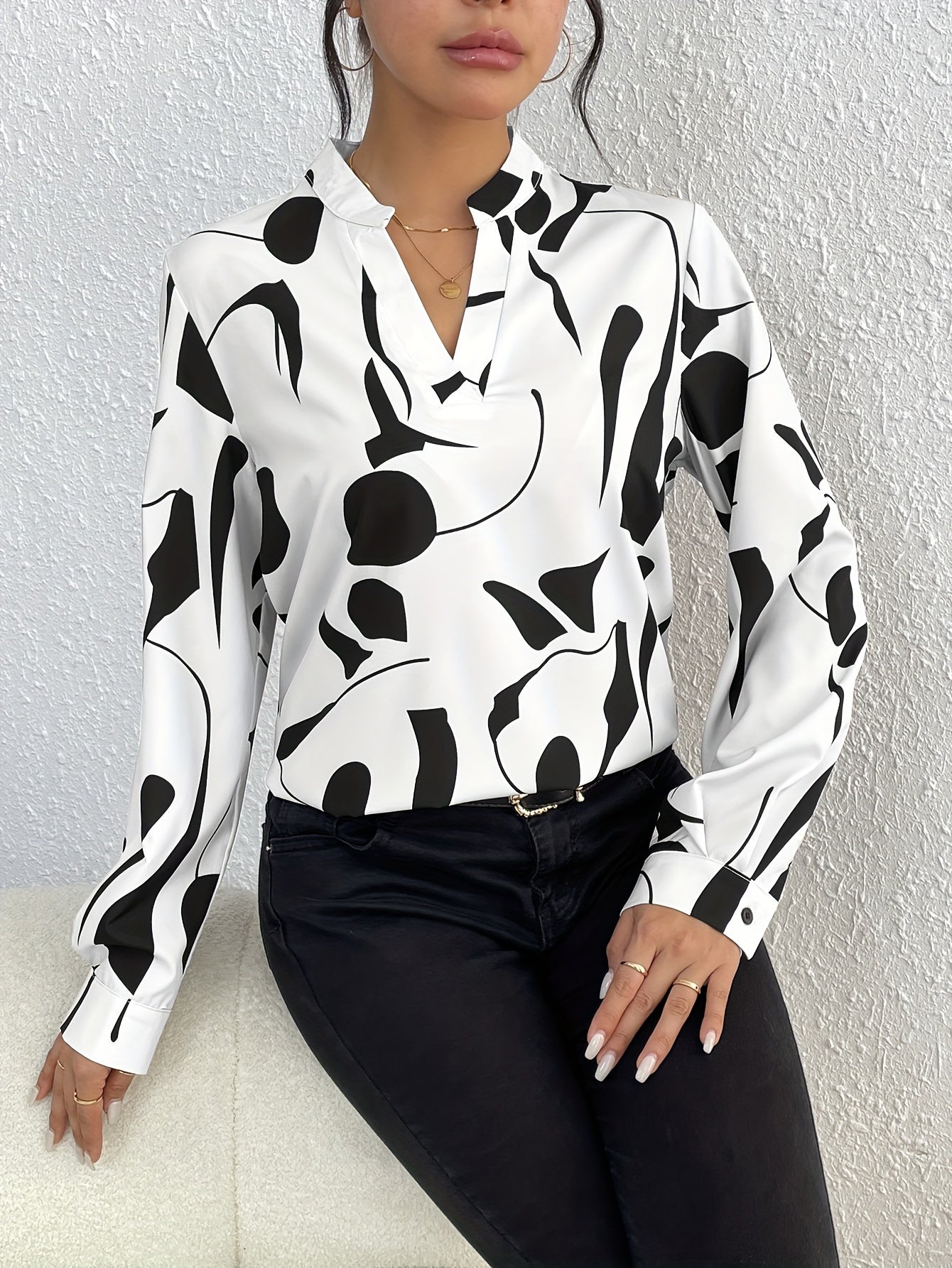 Geo Print V Neck Blouse, Casual Long Sleeve Blouse For Spring & Fall, Women's Clothing
