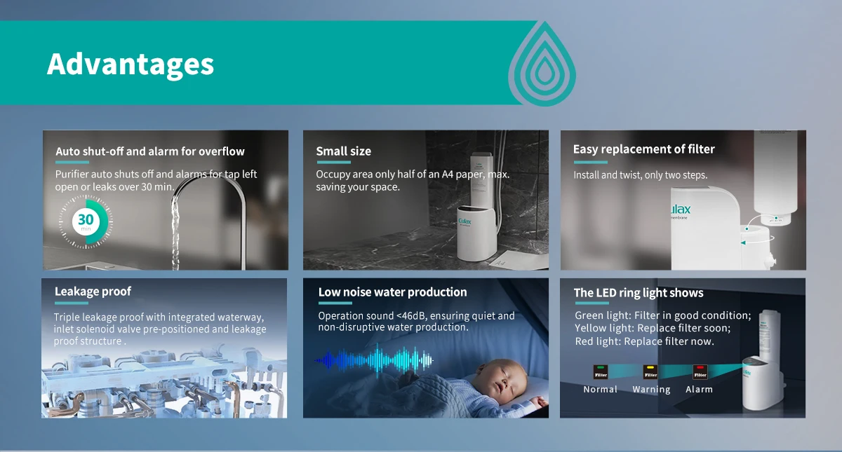Calux is specialized in residential water purification product, commercial RO system, campus direct drinking machine, and industrial water treatment equipment, and other products such as: alkaline water pitcher, refrigerator water filter, carbon block filter cartridge and accessories.