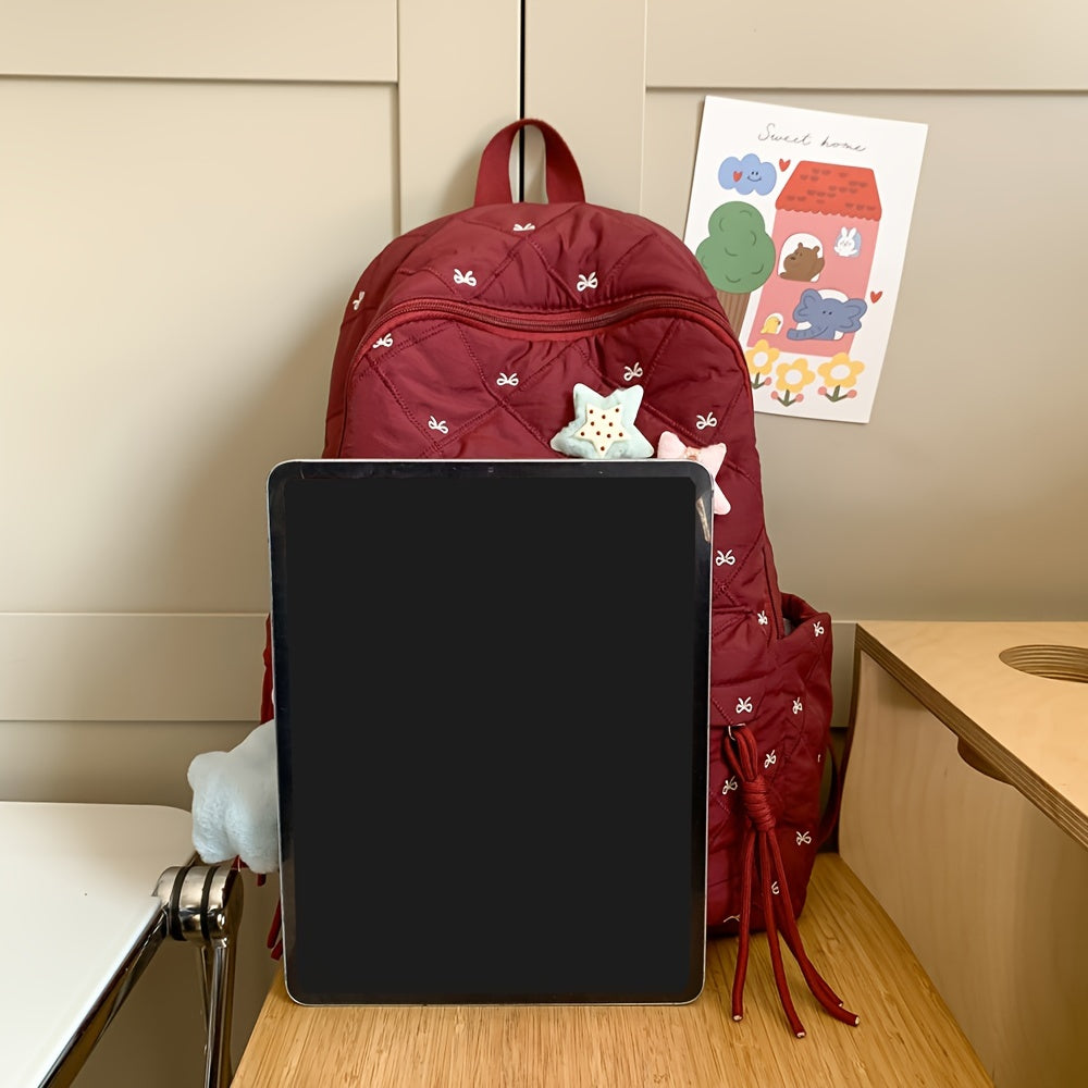 HUOHUO Large Capacity Backpack - Stylish Red & White Quilted Design with Star & Bow Accents, Adjustable Straps, Multiple Compartments, Perfect for School, Commuting, and Everyday Use, Backpack for School, Commuter Bag, Playfu