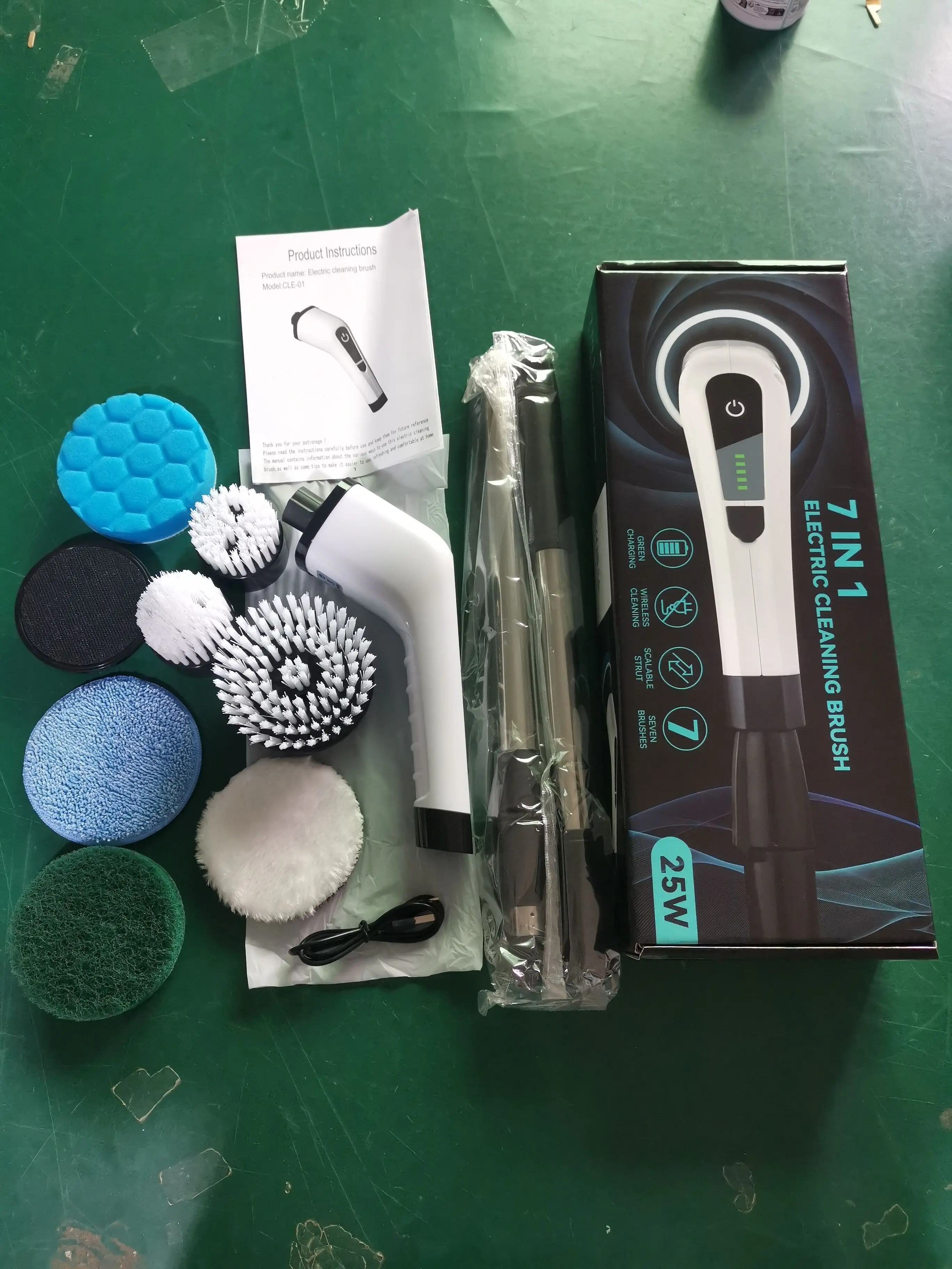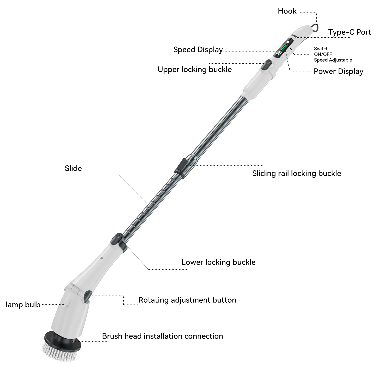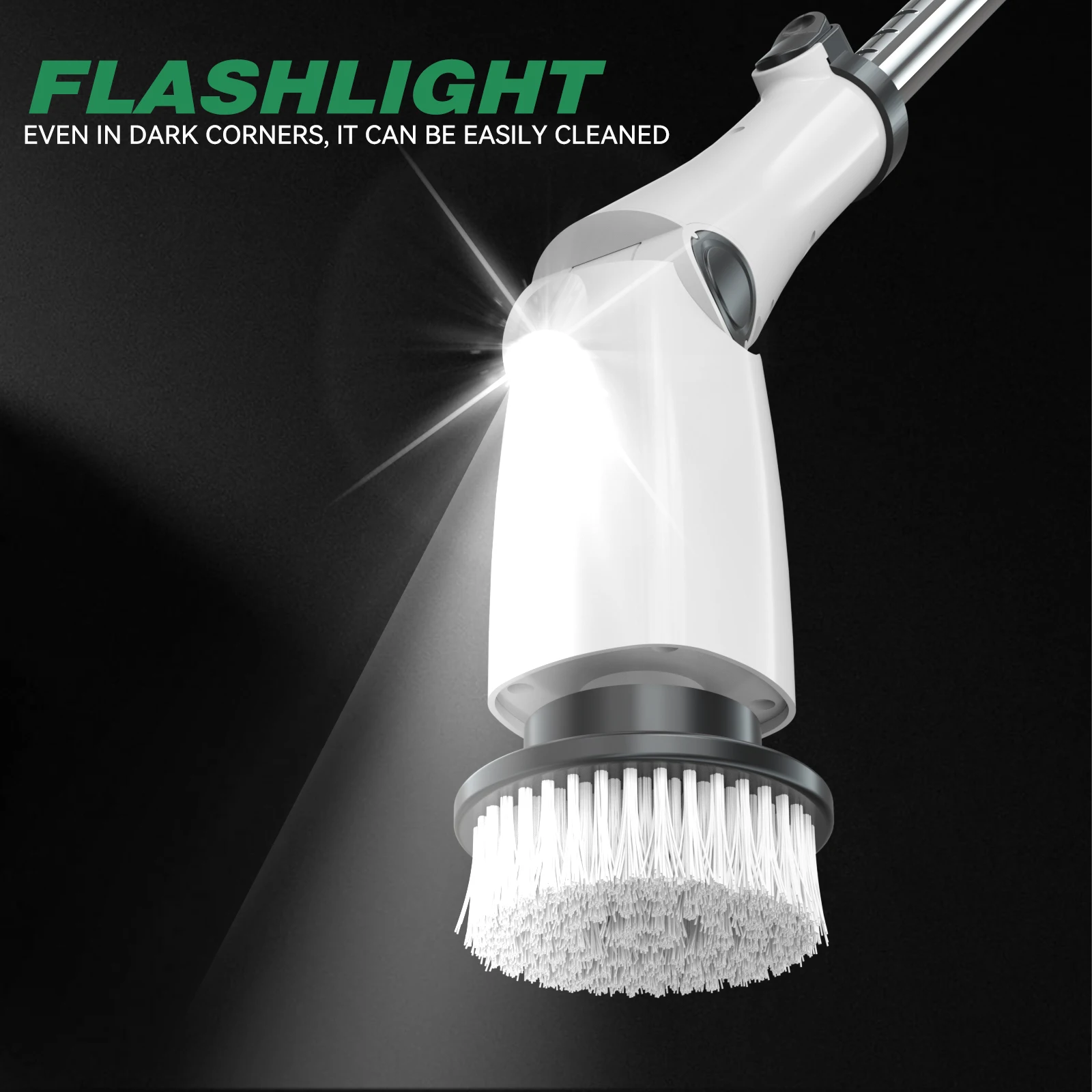 【POWERFUL &CONVENIENT】: Say goodbye to traditional cleaning tools, let the new household cleaning tools change your life. We collected the needs of users from all over the Internet, combined with the advice of top designers, to produce an ergonomic electric spin scrubber. The electric spin scrubber uses top-of-the-line chip technology. Battery capacity up to 5000MAH. The battery takes 3-4 hours to fully charge and will work for up to 90 minutes on a full charge. 【3 ADJUSTABLE SIZES & CORDLESS】: We've updated the brush with 3 adjustable designs and 3 lengths: 12n, 43in and 54in. You can adjust the length by easily rotating the handle and pulling it out. You can also remove and install the handle and extension rod. You can easily clean every corner of the house without having to bend over or kneel down. Caring for the waist and joints, friendly to the elderly and people with waist problems, save time and effort. 【PROTECTION DESIGN】: Electric spin scrubber adopts a tight protection design. It can be used in a humid environment or washed by dipping the brush head in water. You can easily clean shower bathrooms, bathtubs, stone tile floors, grout, and grooves. Cordless design allows you to get rid of rope restrictions, further improving cleaning speed and achieving efficient deep cleaning. Note: Do not immerse the entire handle in water. 【DUAL SPEED & EFFICIENT】: The internal motor system of the electric spin scrubber has 2 speeds: low speed -250RPM and high speed -350RPM. The default speed is low when the brush is started, and long press for 2 seconds to easily switch to high speed. The dual speed design allows you to choose the cleaning method that works for you, eliminating the traditional manual cleaning and saving you valuable time. 【8 REPLACEMENT BRUSH HEADS】: Our electric spin scrubber comes with a wealth of accessories: 8 replaceable brush heads as well as chargers and hooks. The eight replaceable brush heads are suitable for multiple scenarios or can be removed separately for cleaning. Spin scrubber are widely used in bathrooms, kitchens, bathtubs, wood and tile floors, glass, tires and cars. The bristles are soft and of good quality and will not scratch tiles, glass and cars. You can use it at ease.