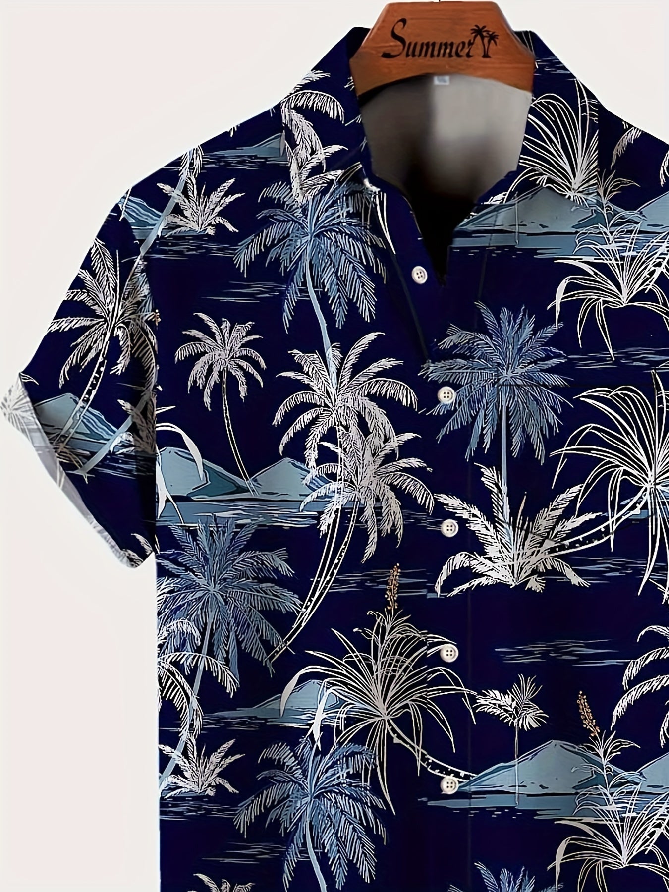 Men's Hawaiian Coconut Tree Print Button-Up Shirt - Tropical Vacation Style Short Sleeve Summer Shirt with Navy Blue & White Palm Design, Machine Washable Regular Fit for Beach Outings & Casual Wear, Hawaiian Shirt, Nontransp