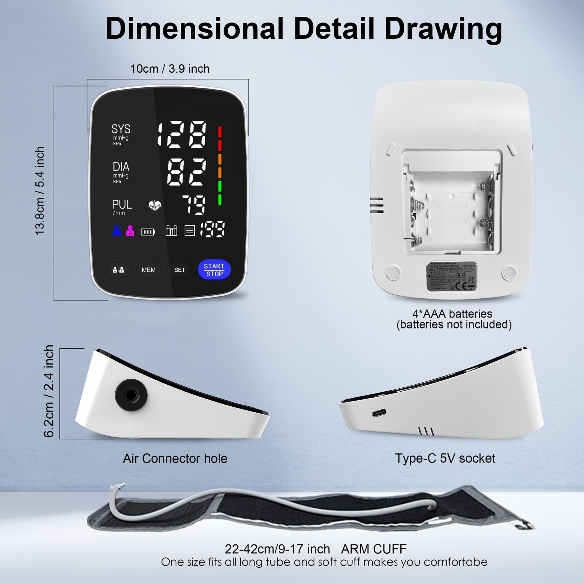 NEW LED High-End Curved Screen Home Precision Sphygmomanometer, 2x199 Memory with 22.1-43.18 cm Blood Pressure CuffAutomatic Upper Arm Cuff Digital Sphygmomanometer with C-Cable for Gifts, Family, Parents, and Friends