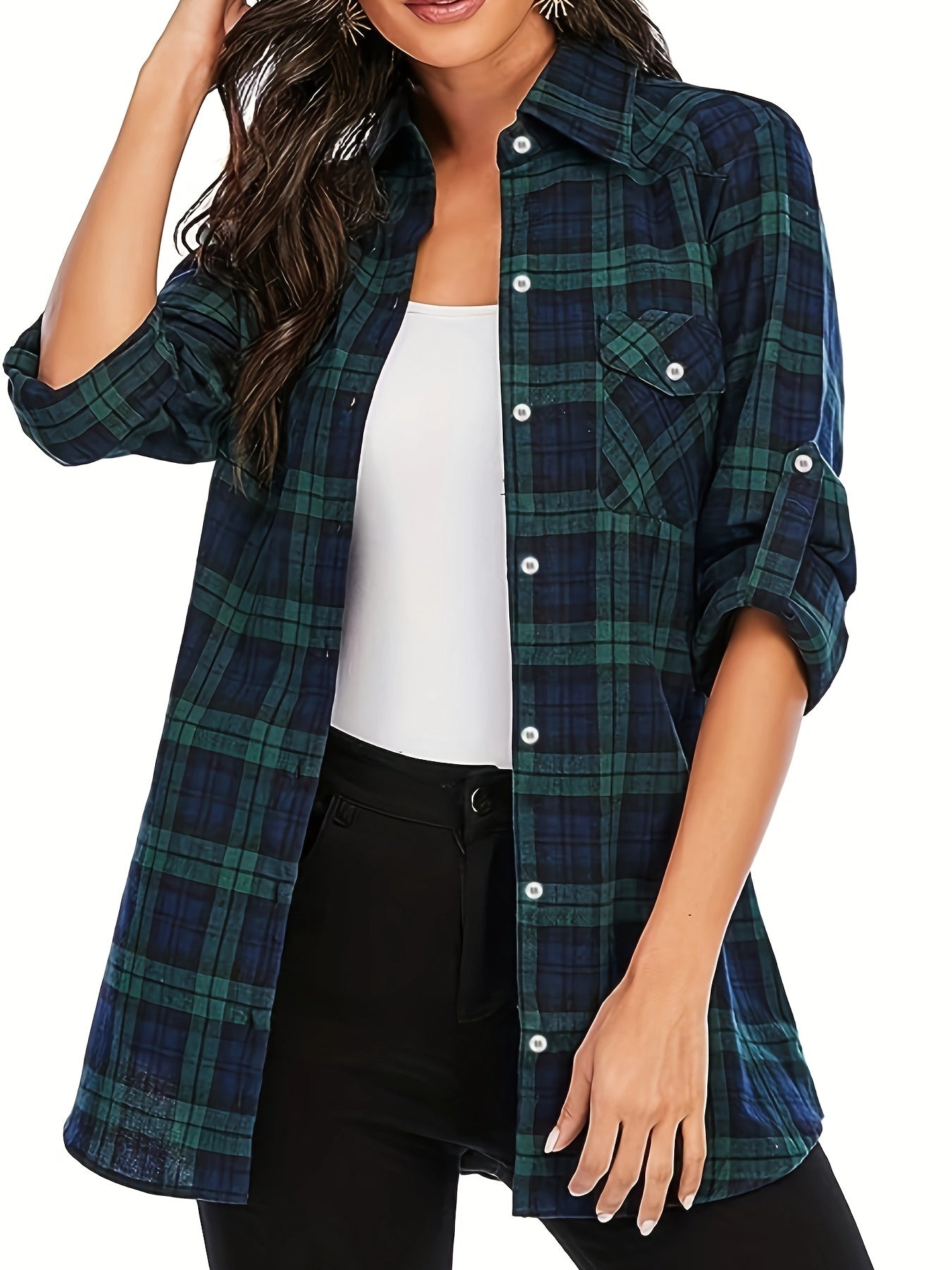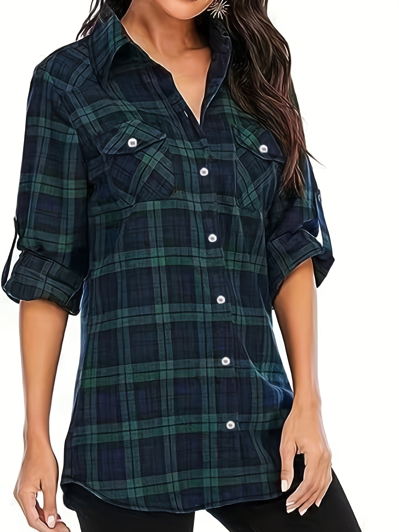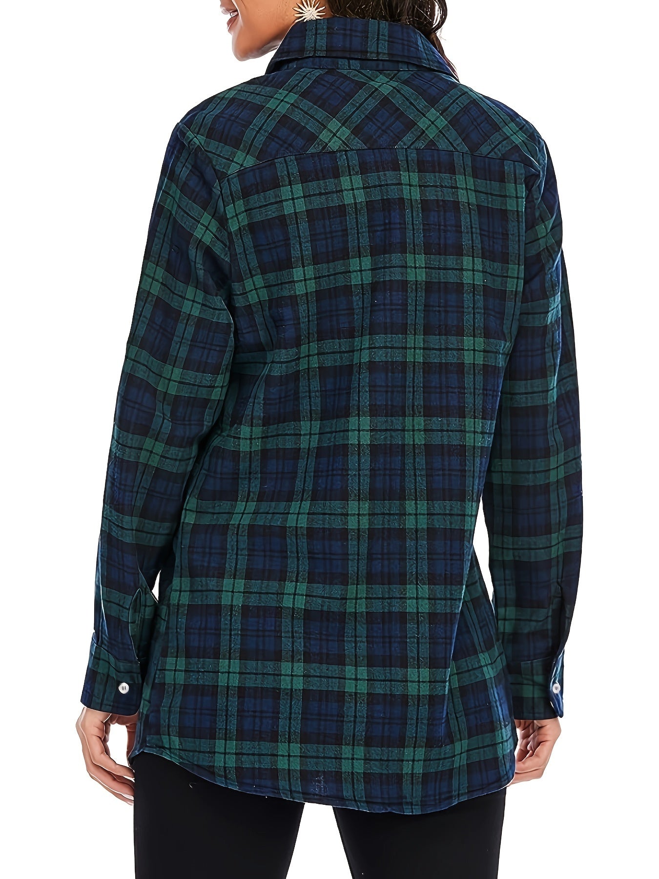 Plus Size Casual Top, Women's Plus Plaid Print Button Up Long Sleeve Turn Down Collar Blouse
