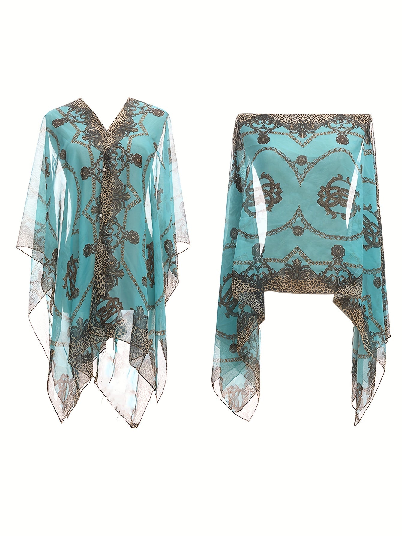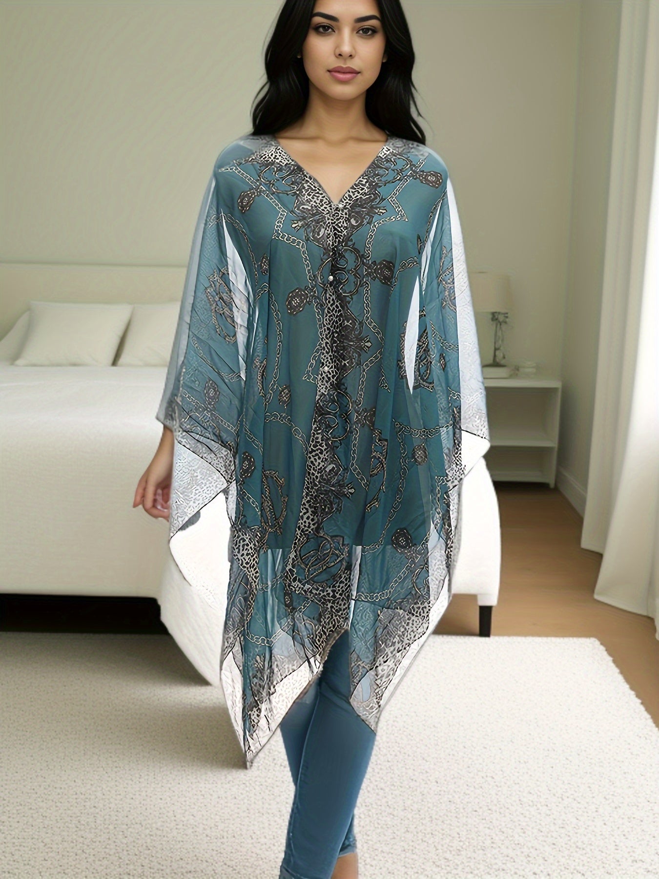 Plus Size Chain Print V Neck Shawl Top, Elegant Long Sleeve Blouse For Spring & Summer, Women's Plus Size Clothing