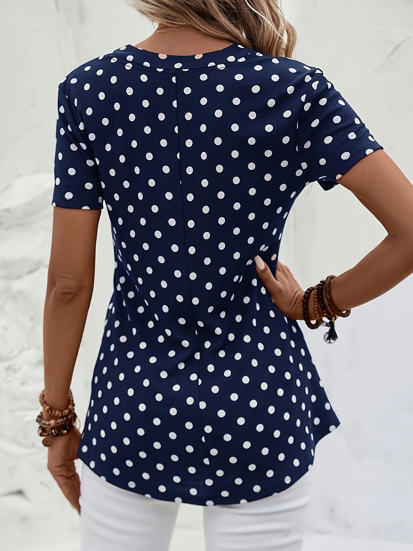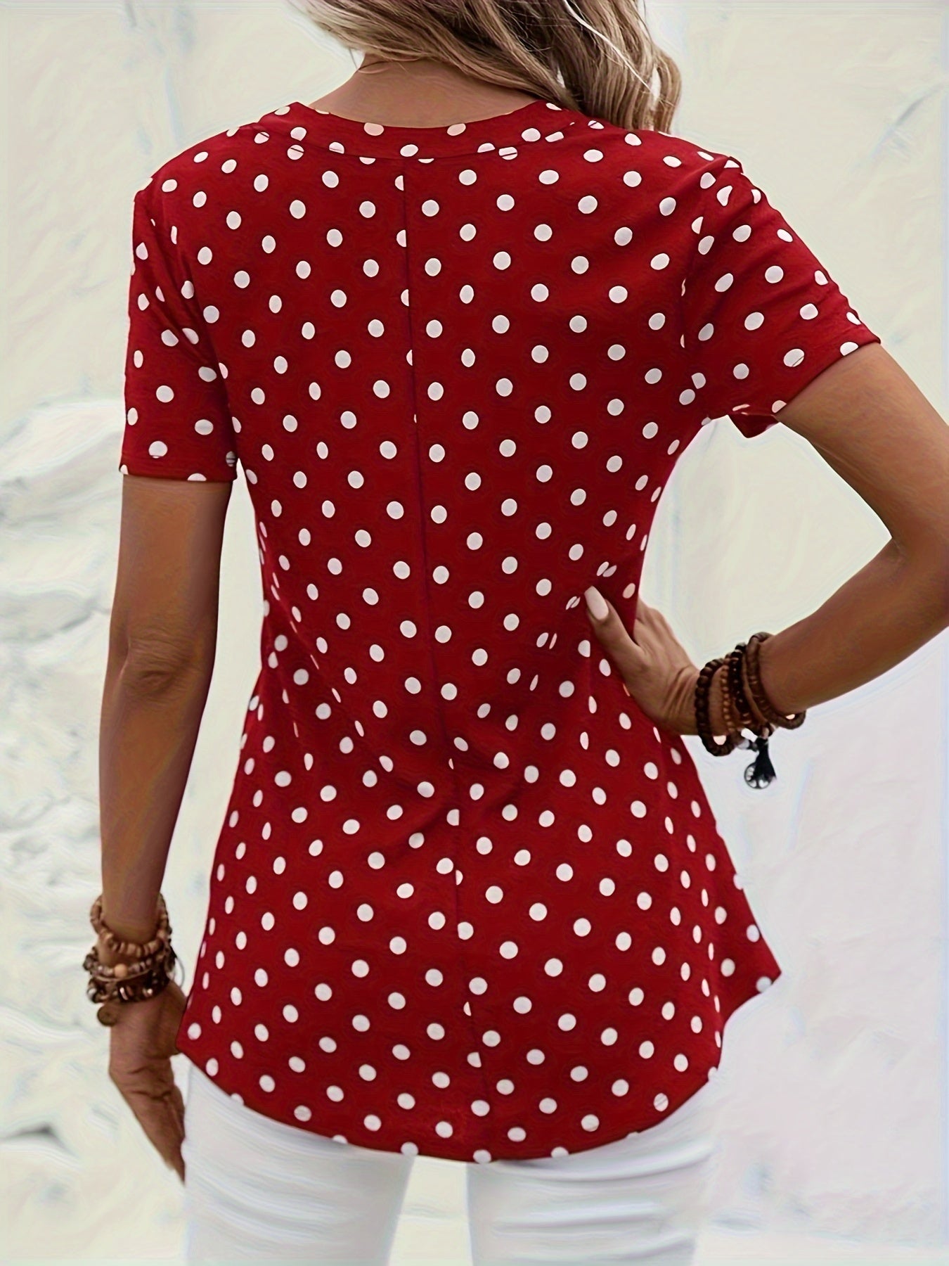 Polka Dots Print V Neck Blouse, Elegant Zipper Front Short Sleeve Blouse For Spring & Summer, Women's Clothing
