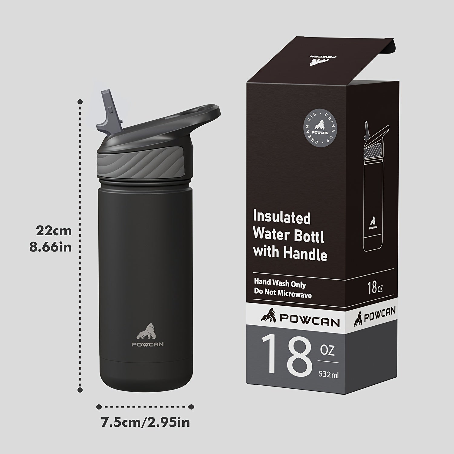Powcan 18oz Stainless Steel Insulated Water Bottle Double Wall Insulated Bottle Travel Mug with Flip-Top Straw Lid, Leakproof Reusable Sip Cup with Handle, Sports Drinking Cup for Gym, Office, or Car Use