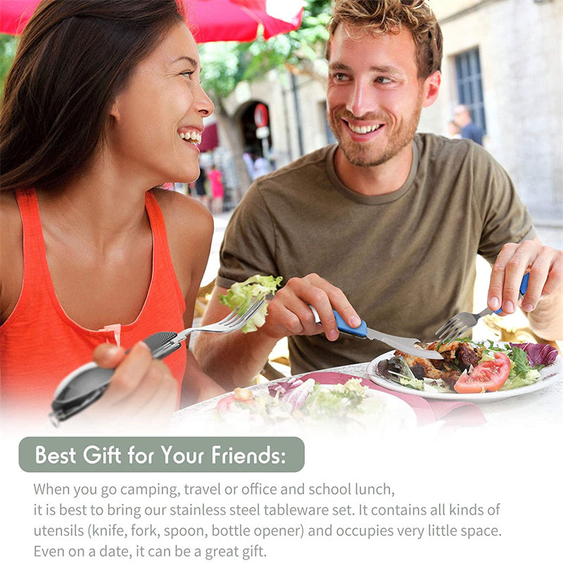 Stainless Steel 4-in-1 Outdoor Tableware Set with Folding Spoon, Fork, Knife, and Bottle Opener - Perfect for Camping, Picnics, Hiking, and Travel
