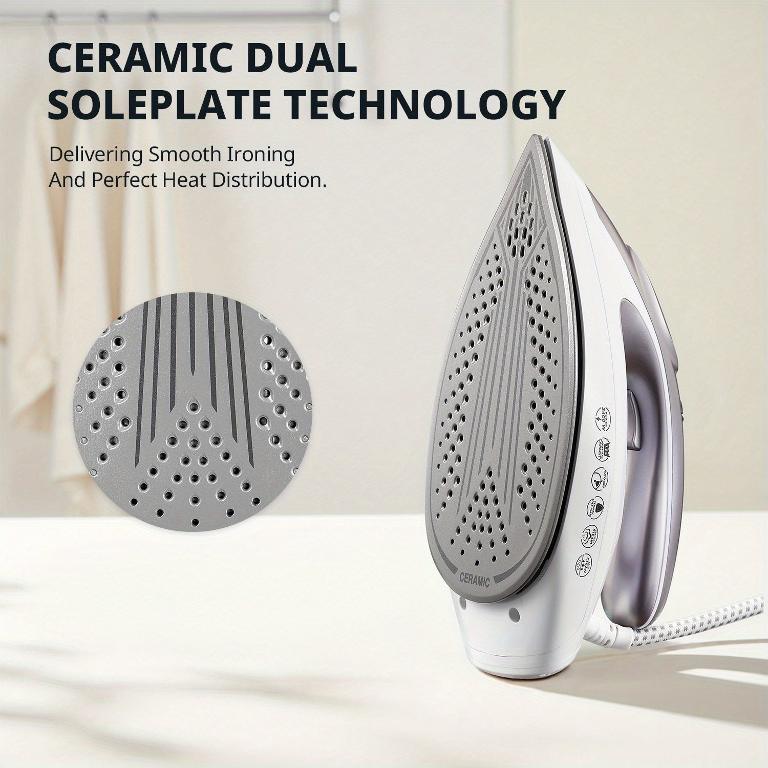 Steam Station Iron offers 5.5 bar pressure, a 1.5L water tank, a ceramic soleplate, an anti-limescale function, vertical steaming, three adjustable temperatures, cord storage, 2400W power, and comes in light purple., Steam Ir